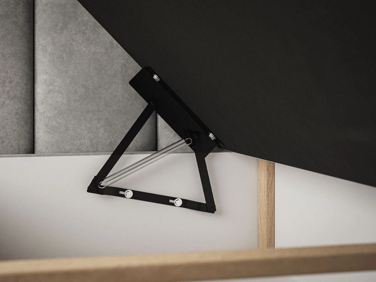 Funkcjonalność na co dzień. Łóżko kontynentalne Cascada łączy w sobie elegancję i praktyczne rozwiązania. Model wyposażono w dwa pojemne schowki na pościel, które ułatwiają organizację przestrzeni. Mechanizm sprężynowy wspomaga otwieranie, umożliwiając łatwy dostęp do przechowywanych tekstyliów bez zbędnego wysiłku.