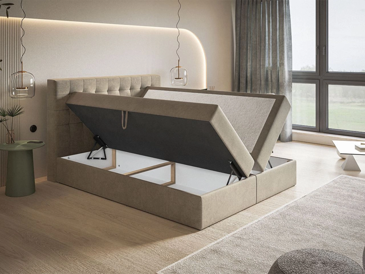 Funkcjonalność na co dzień. Łóżko kontynentalne Denza to nie tylko elegancja, ale także praktyczne rozwiązania. Model wyposażono w dwa pojemne schowki na pościel, które ułatwiają organizację przestrzeni. Mechanizm sprężynowy wspomaga otwieranie, umożliwiając łatwy dostęp do przechowywanych tekstyliów bez zbędnego wysiłku.