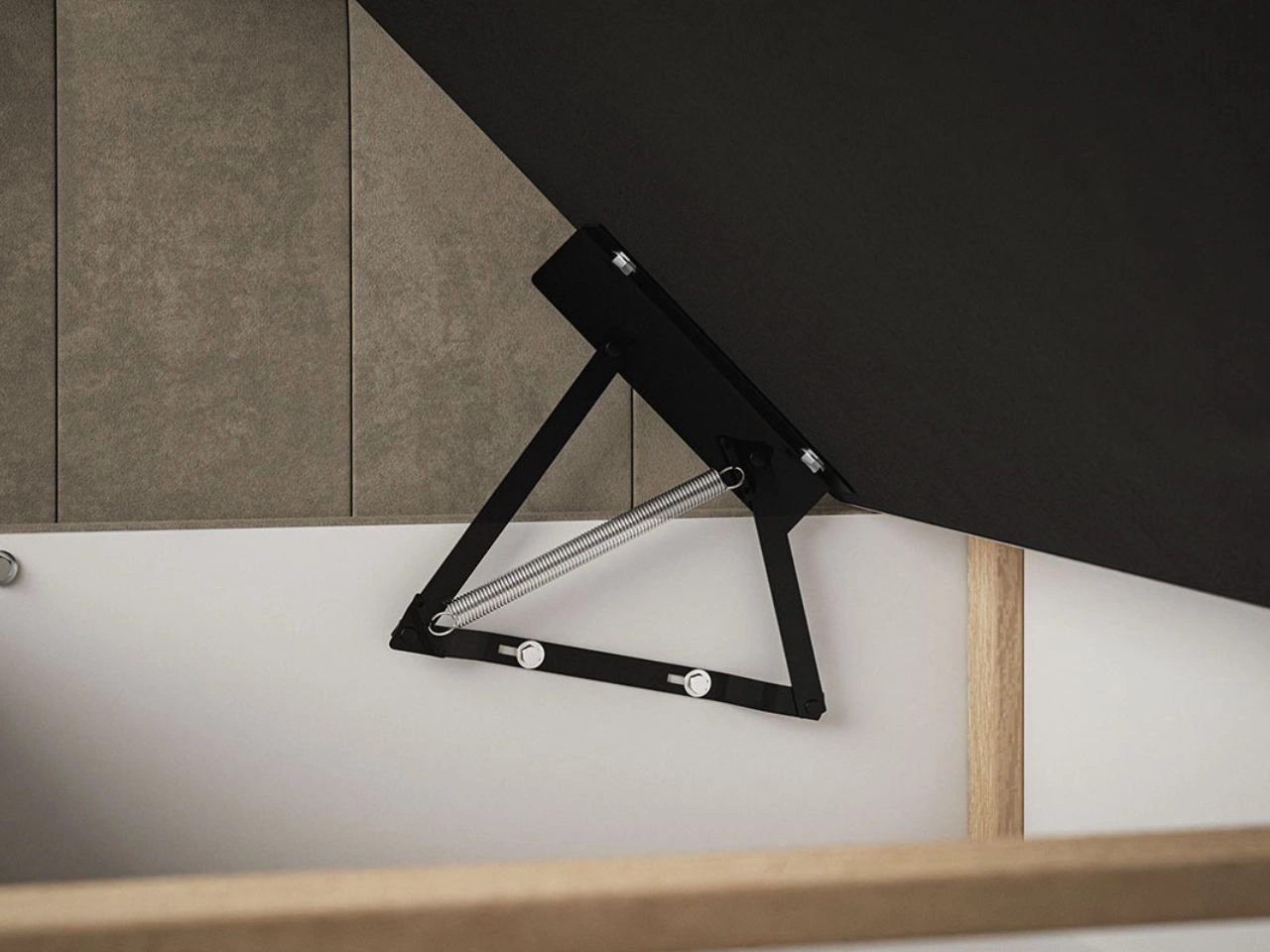 Funkcjonalność na co dzień. Łóżko kontynentalne Denza to nie tylko elegancja, ale także praktyczne rozwiązania. Model wyposażono w dwa pojemne schowki na pościel, które ułatwiają organizację przestrzeni. Mechanizm sprężynowy wspomaga otwieranie, umożliwiając łatwy dostęp do przechowywanych tekstyliów bez zbędnego wysiłku.