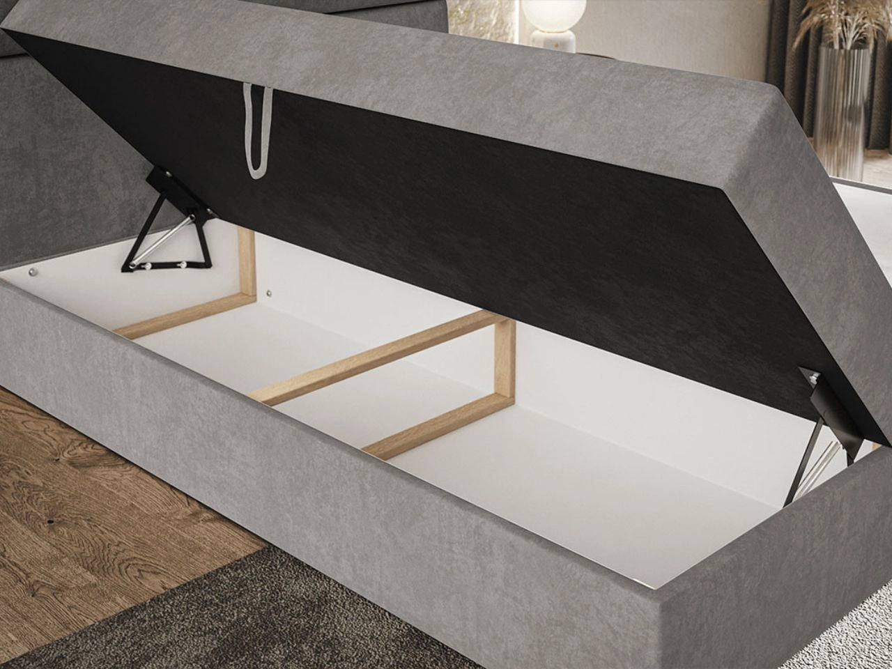Praktyczne rozwiązania na co dzień - łóżko kontynentalne Hera to nie tylko komfort, ale również funkcjonalność. Model wyposażony jest w dwa pojemne schowki na pościel, które ułatwiają przechowywanie kołder, poduszek i innych tekstyliów. System automatów sprężynowych wspomaga otwierania i pozwala na łatwy dostęp do przestrzeni magazynowej, bez potrzeby używania dużej siły.
