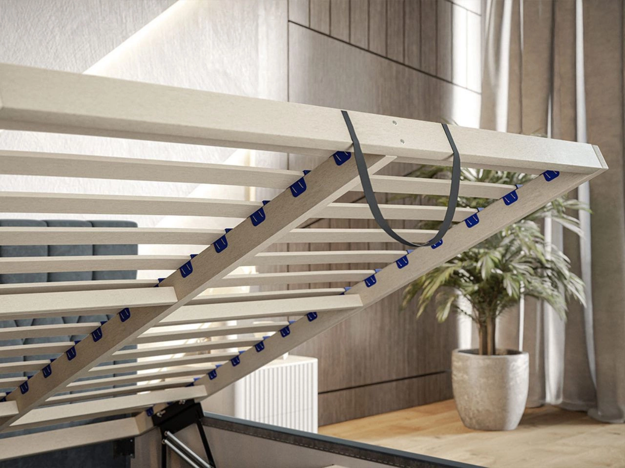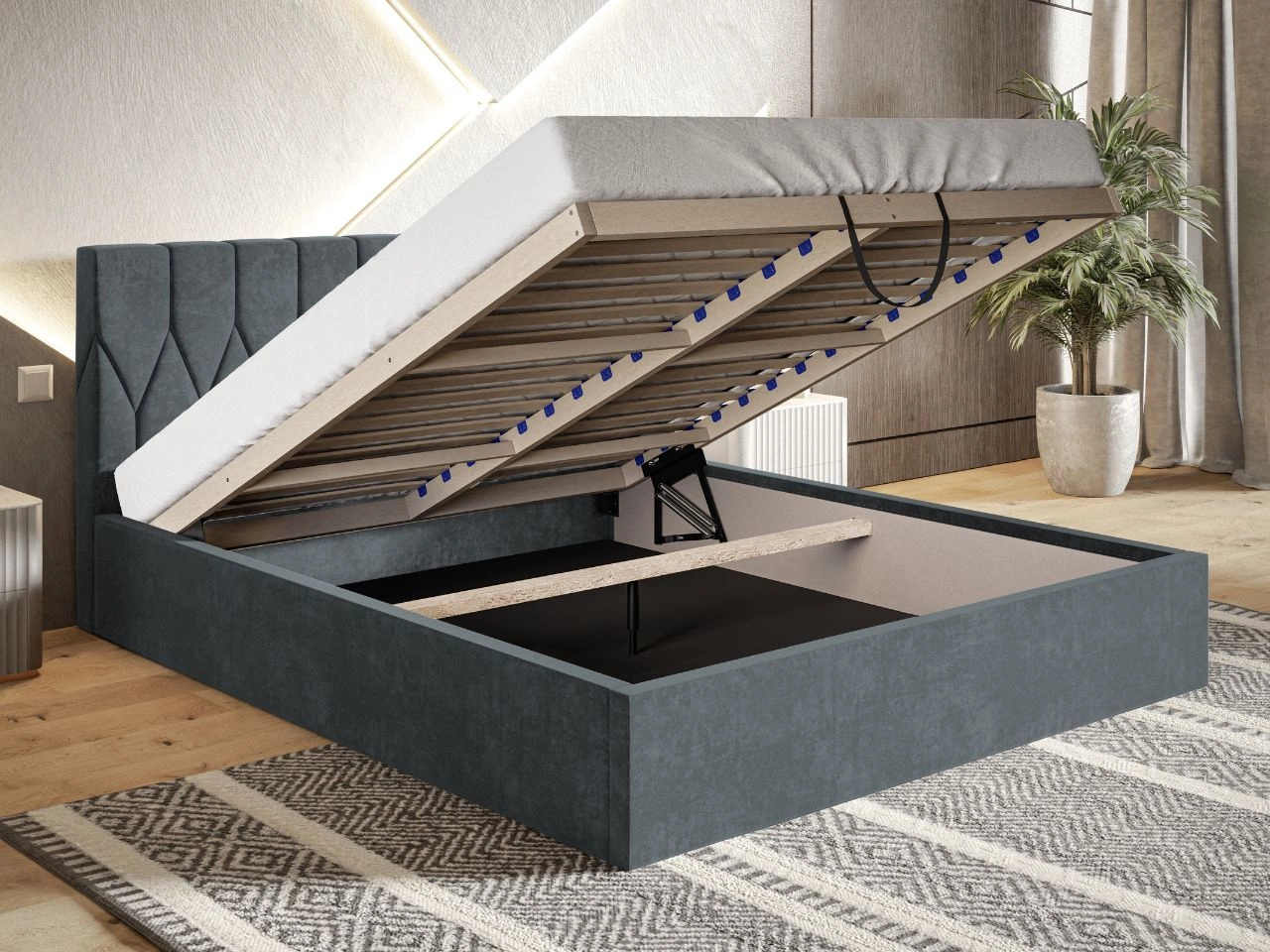 Łóżko tapicerowane Gaja wyposażone zostało również w przestronny pojemnik na pościel, który ulokowano pod dołączonym do zestawu drewnianym stelażem pod materac (Łóżko sprzedawane jest bez materaca). Aby otworzyć pojemnik, wystarczy jedynie unieść ku górze stelaż, używając do tego dedykowanego uchwytu. Czynność ta nie nastręcza trudności dzięki zastosowaniu automatów sprężynowych wspomagających otwieranie. Skrzynia łóżka Gaja wykonana została z wysokiej klasy płyty meblowej, którą wzmocniono solidną drewnianą ramą. Dzięki temu cała konstrukcja posiada odpowiednią sztywność i wytrzymałość, co gwarantuje wieloletnie i bezproblemowe użytkowanie.