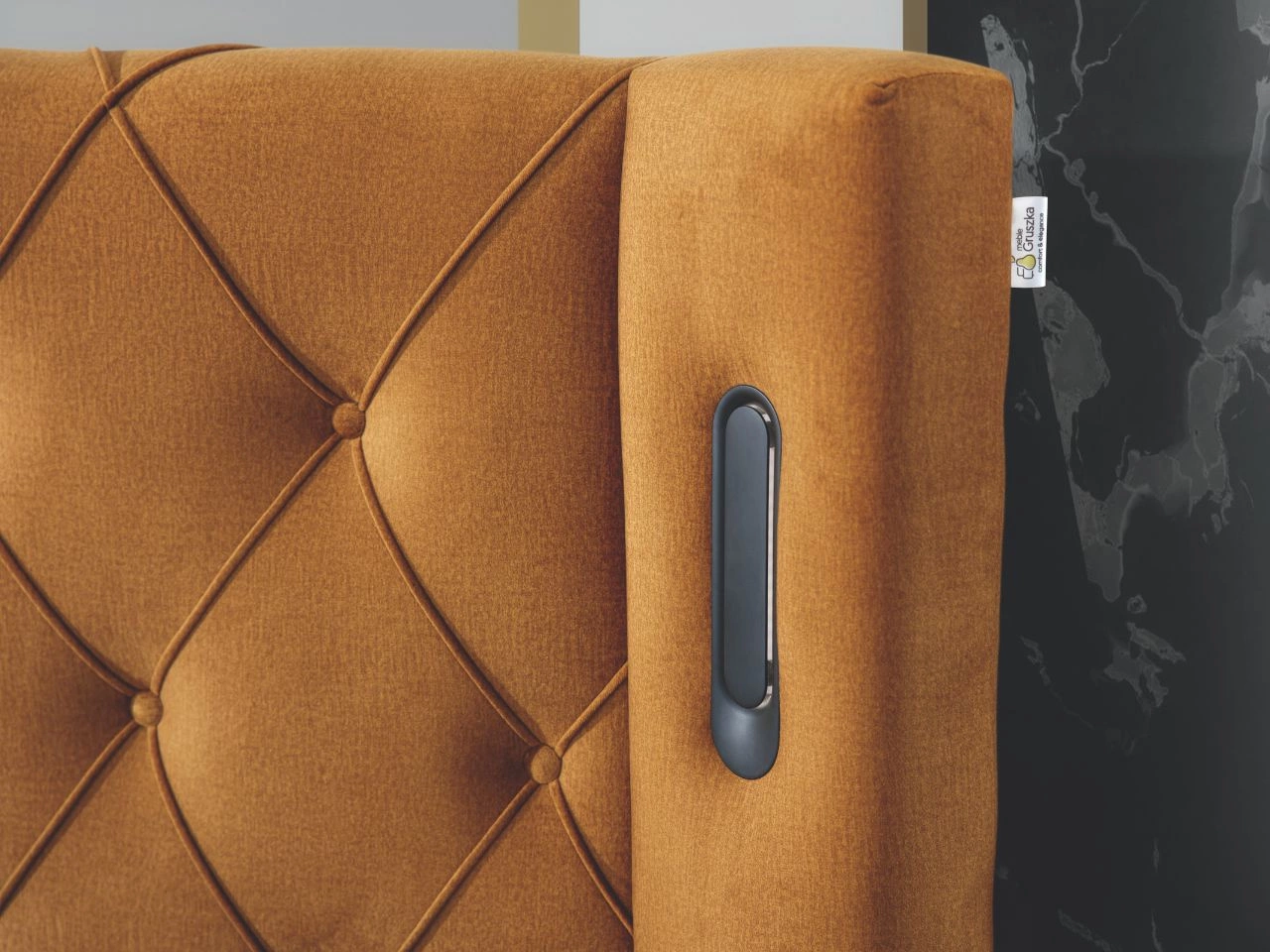 Eleganckie pikowane wezgłowie w stylu glamour z oświetleniem LED nadaje mu wyjątkowego charakteru, a dwa pojemne schowki na pościel, otwierane z boku, gwarantują praktyczność i wygodę. Dodatkowo, mechanizm sprężynowy ułatwia otwieranie pojemników, umożliwiając wygodne przechowywanie kołder, poduszek i innych przedmiotów.