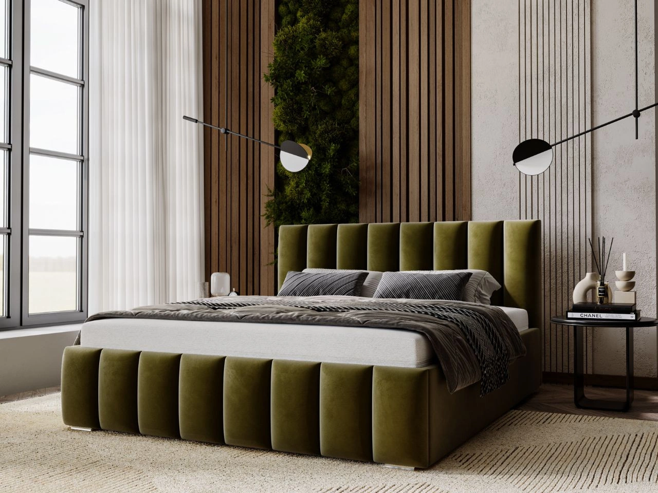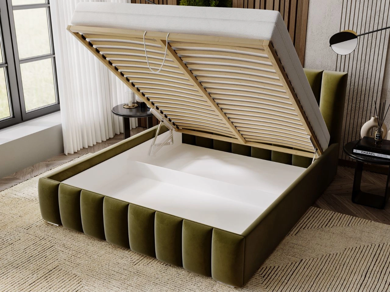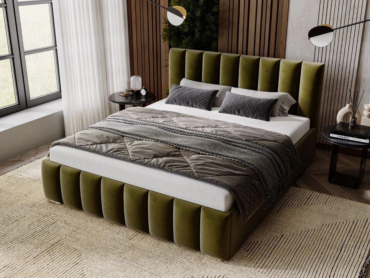 Łóżko tapicerowane z pojemnikiem i stelażem 200x200 Neos Zielone
