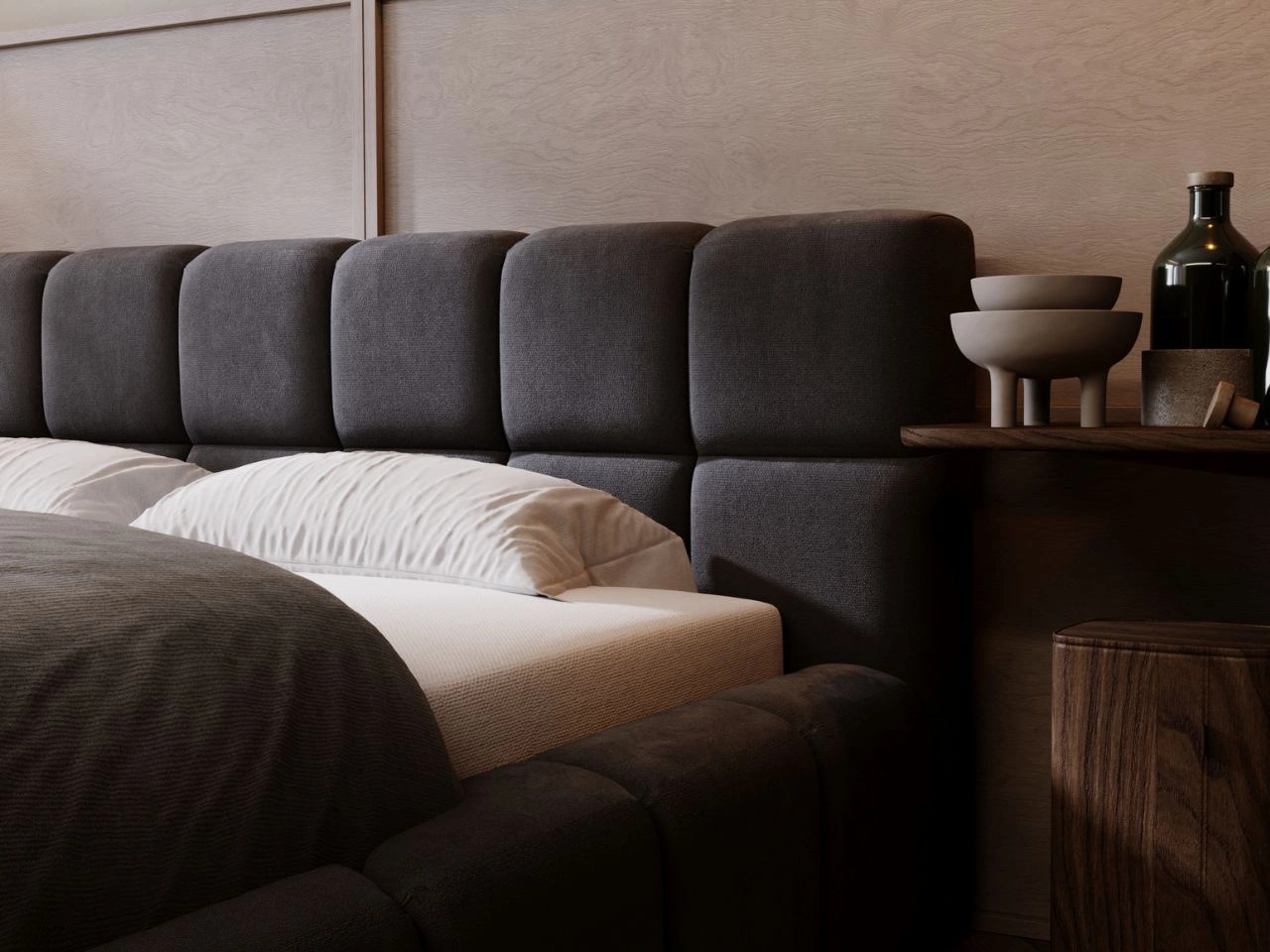 Łóżko tapicerowane Alicatne, to bardzo interesujący model dla każdego, kto ceni sobie prosty i nowoczesny design i funkcjonalność w jednym. Mebel charakteryzuje się masywnym, szerokim wezgłowiem, którego powierzchnię pokryto miękką pianką tapicerską i ozdobiono kwadratowymi przeszyciami, co idealnie wpasuje się we współczesne aranżacje wnętrz i jednocześnie zachowa ponadczasowy, modny wygląd.