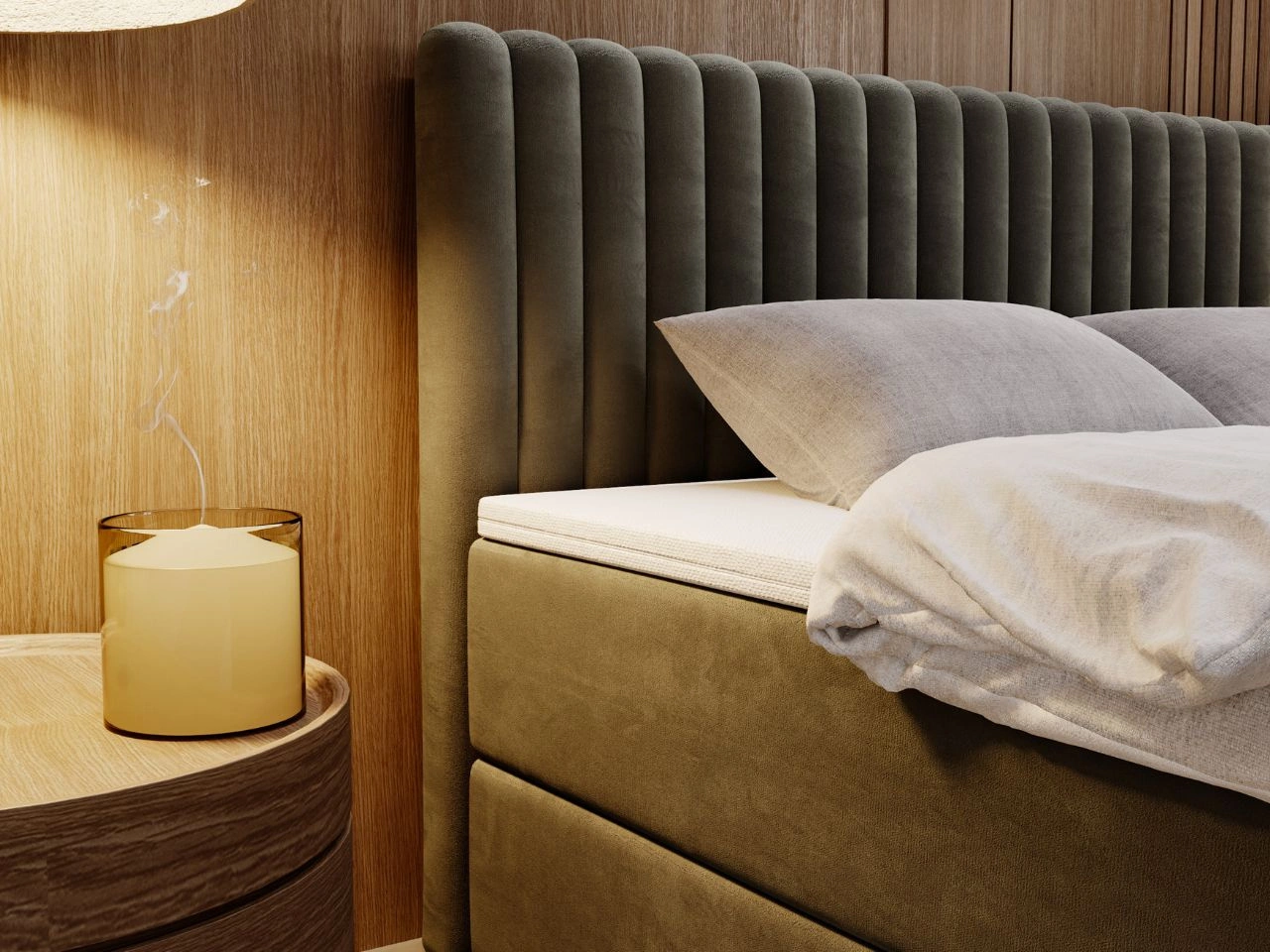 Łóżko kontynentalne z pojemnikiem Marbella cechuje prosta i zarazem wyrafinowana bryła. Każdy element został starannie dobrany, aby stworzyć spójny i urzekający mebel pasujący zarówno do klasycznych, jak i nowoczesnych aranżacji sypialni. Łóżko kontynentalne Marbella wyposażone zostało w dwa pojemniki na pościel pod łóżkiem, które pozwalają zachować porządek w sypialni i optymalnie wykorzystać dostępną przestrzeń. Dodatkowo dużym plusem tego modelu są dwa wygodne materace. Materac główny oparty jest na systemie sprężyn typu bonell i piance T25, natomiast nakładka zwana topperem wykonana jest z pianki wysokoelastycznej o grubości 5 cm.