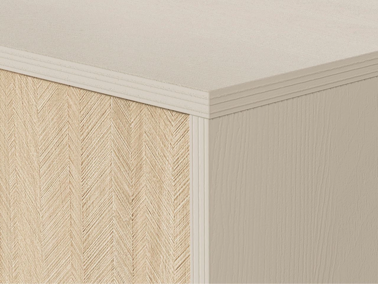 Fronty komody z szufladami w dekorze jodełki prezentują się bardzo nietypowo i oryginalnie, nadając wnętrzu niezwykłego charakteru. Połączone z delikatnymi złotymi uchwytami podkreślają stylową aranżację salonu, sypialni lub innego pomieszczenia.
