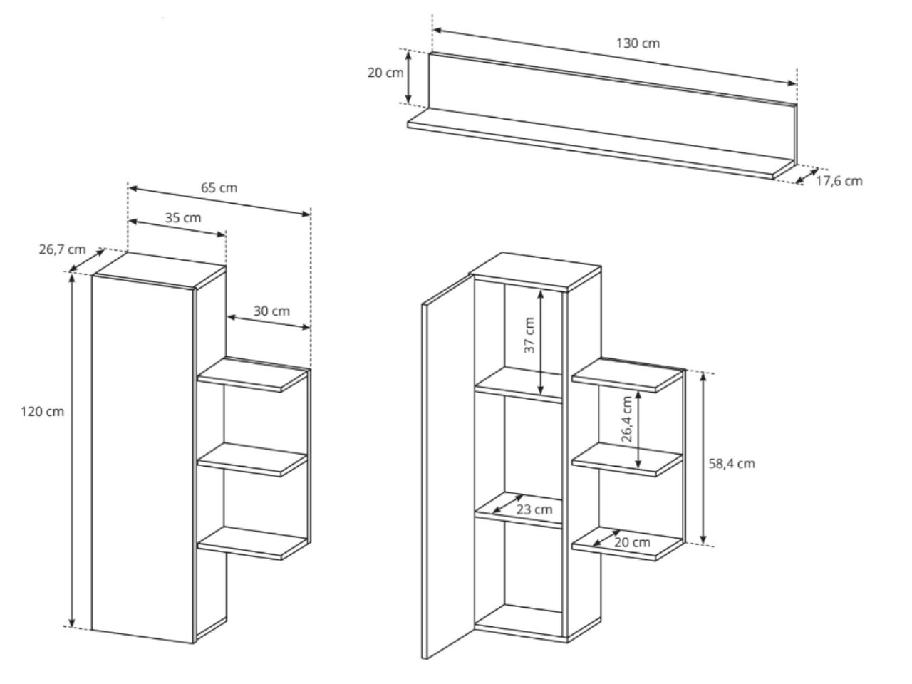 - Półka ścienna, idealna na książki, dekoracje lub rośliny, zapewniająca przestronność i możliwość indywidualnej aranżacji.