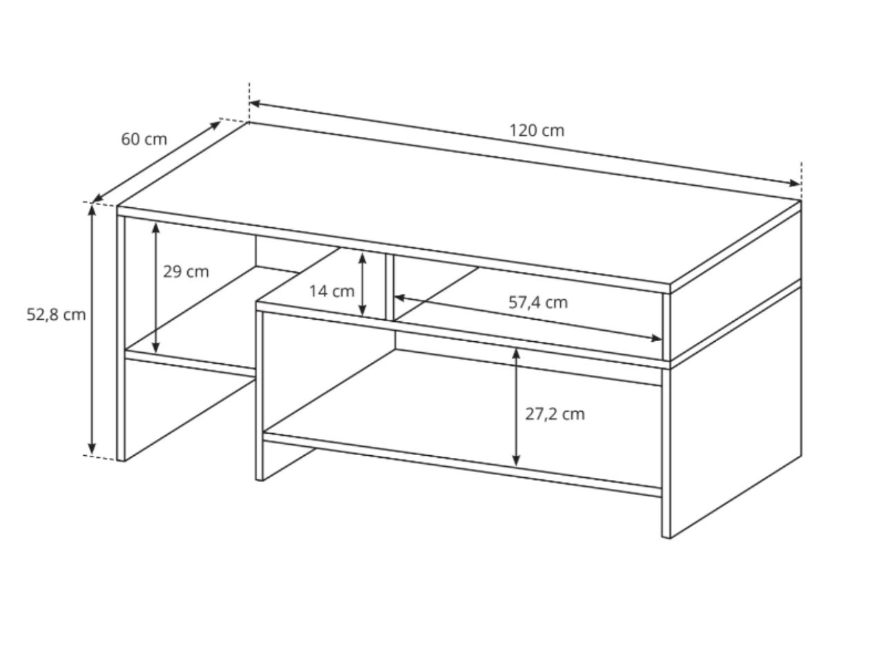 Stolik kawowy, utrzymany w tym samym stylu, idealnie dopełnia zestaw. Dzięki praktycznym półkom zapewnia miejsce na magazyny, piloty lub dekoracyjne akcesoria. Jego prostokątny kształt czyni go zarówno funkcjonalnym, jak i kompaktowym, dzięki czemu doskonale sprawdzi się w mniejszych i większych pomieszczeniach.