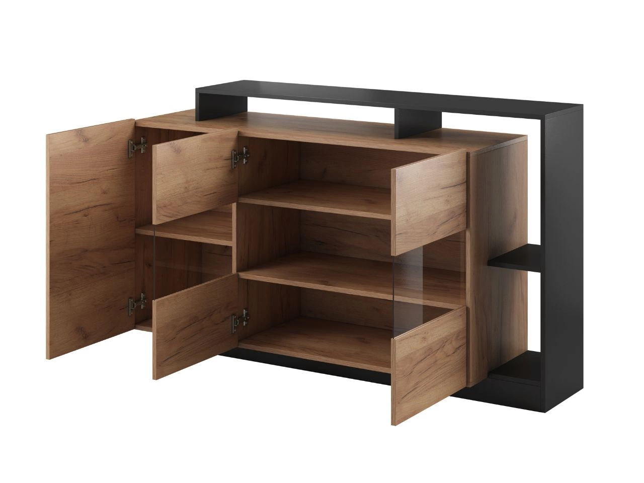 Komoda to doskonałe połączenie elegancji i funkcjonalności. Posiada przestronne szafki oraz półki z transparentnymi frontami, które umożliwiają stylową ekspozycję porcelany, pamiątek lub dekoracji. Połączenie naturalnego dekoru drewna z antracytowymi elementami dodaje wnętrzu nowoczesnej elegancji i subtelnej lekkości.