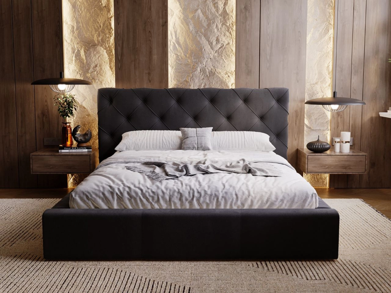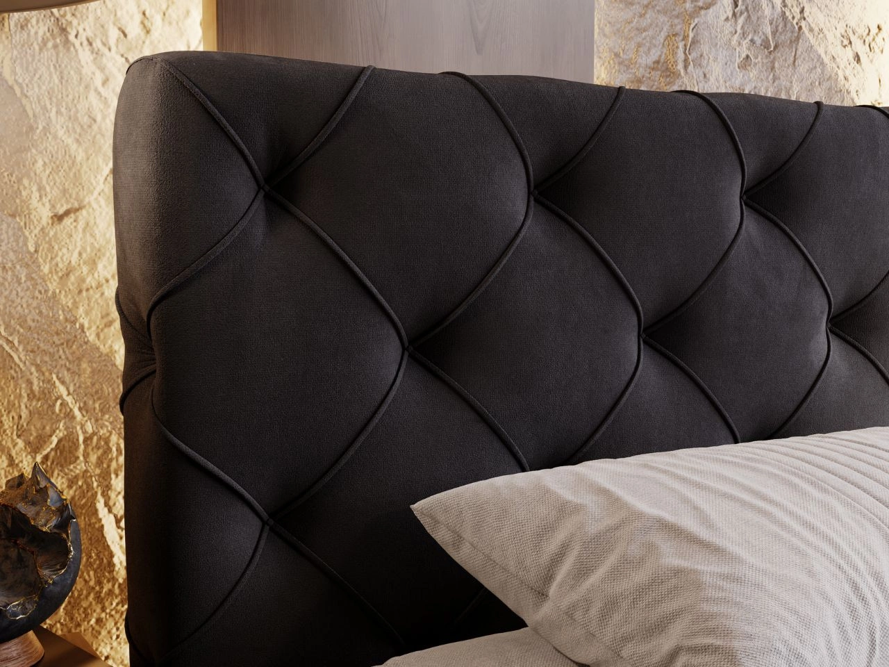 - Tył łóżka tapicerowany czarnym wigofilem