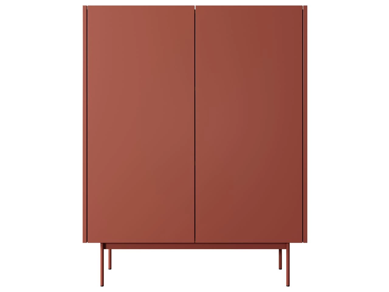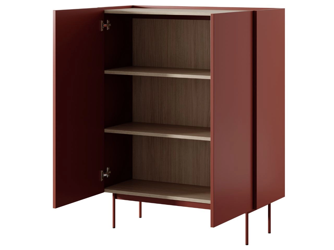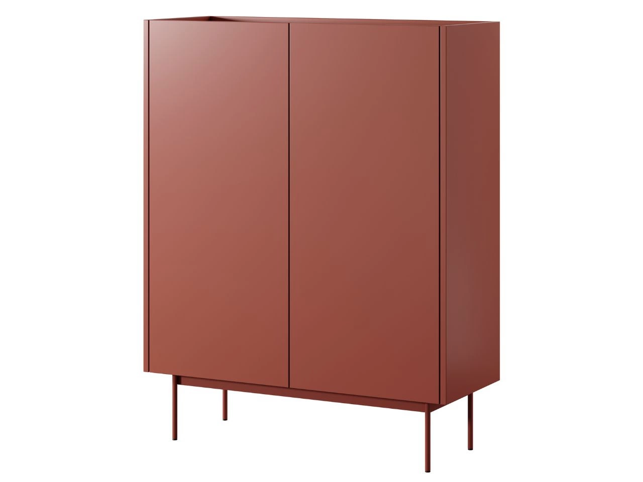 Nowoczesny design: Komoda zachwyca prostą, geometryczną bryłą z delikatnie zaokrąglonymi krawędziami, co dodaje jej subtelności. Eleganckie, wysokie nóżki optycznie odciążają konstrukcję, nadając jej lekkości. Gładkie, jednolite fronty w ciepłym odcieniu czerwieni ziemi doskonale komponują się z delikatnym blatem w naturalnym odcieniu dębu (prawdopodobnie Sonoma), tworząc harmonijny kontrast.