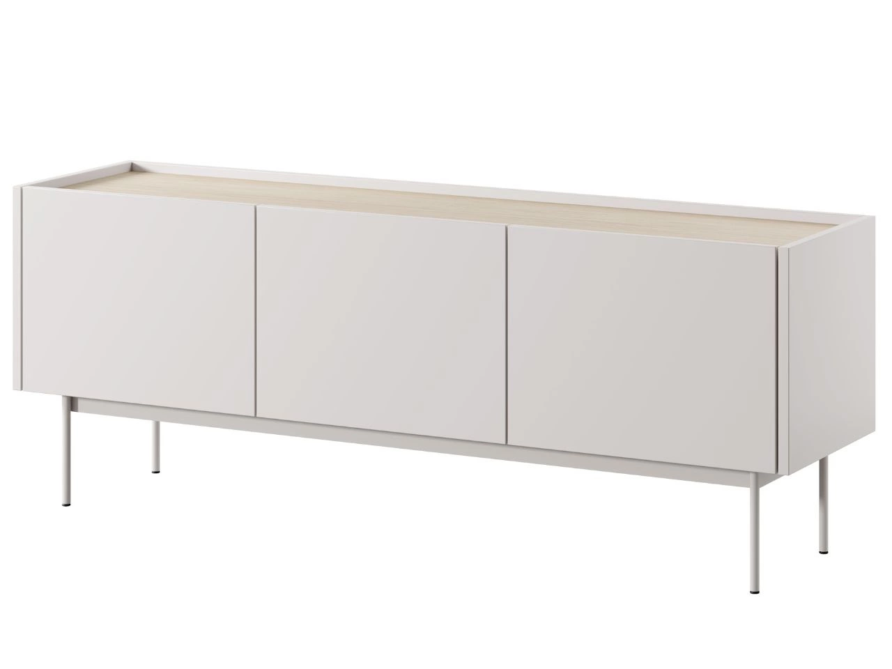 Szafka RTV jest centralnym elementem salonu, łączącym funkcjonalność z wyrafinowanym designem. Jej niska konstrukcja na wysokich, smukłych nóżkach optycznie unosi bryłę, nadając jej lekkości. Gładkie, bezuchwytowe fronty w białym wykończeniu są eleganckie i jednocześnie praktyczne.