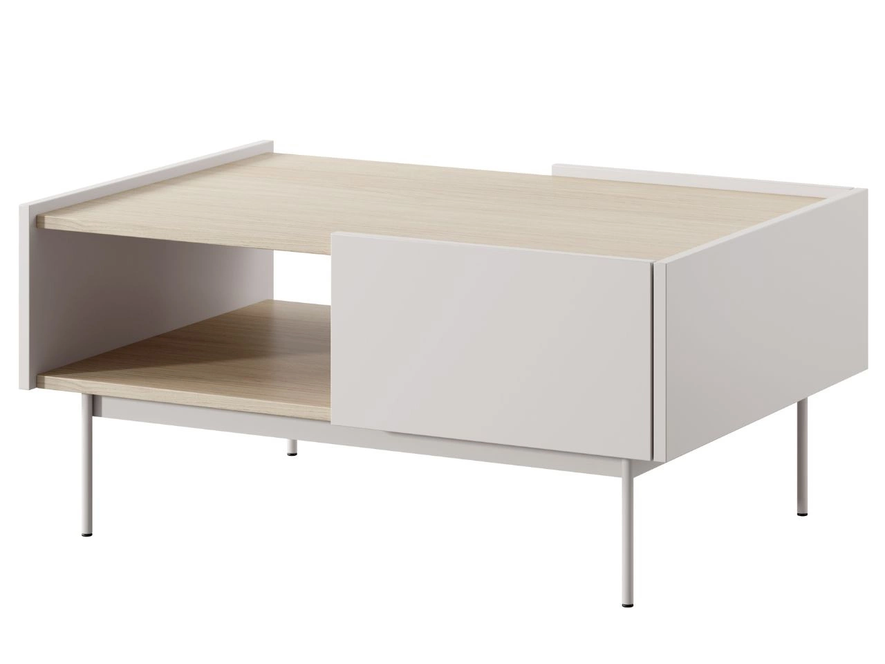 Stolik kawowy z tej kolekcji to kwintesencja nowoczesnej prostoty. Jego niska sylwetka i subtelne nóżki idealnie korespondują z pozostałymi elementami zestawu. Blat w ciepłym, naturalnym odcieniu dębu (najprawdopodobniej Sonoma) wprowadza do wnętrza przytulność, kontrastując z jasnymi frontami.