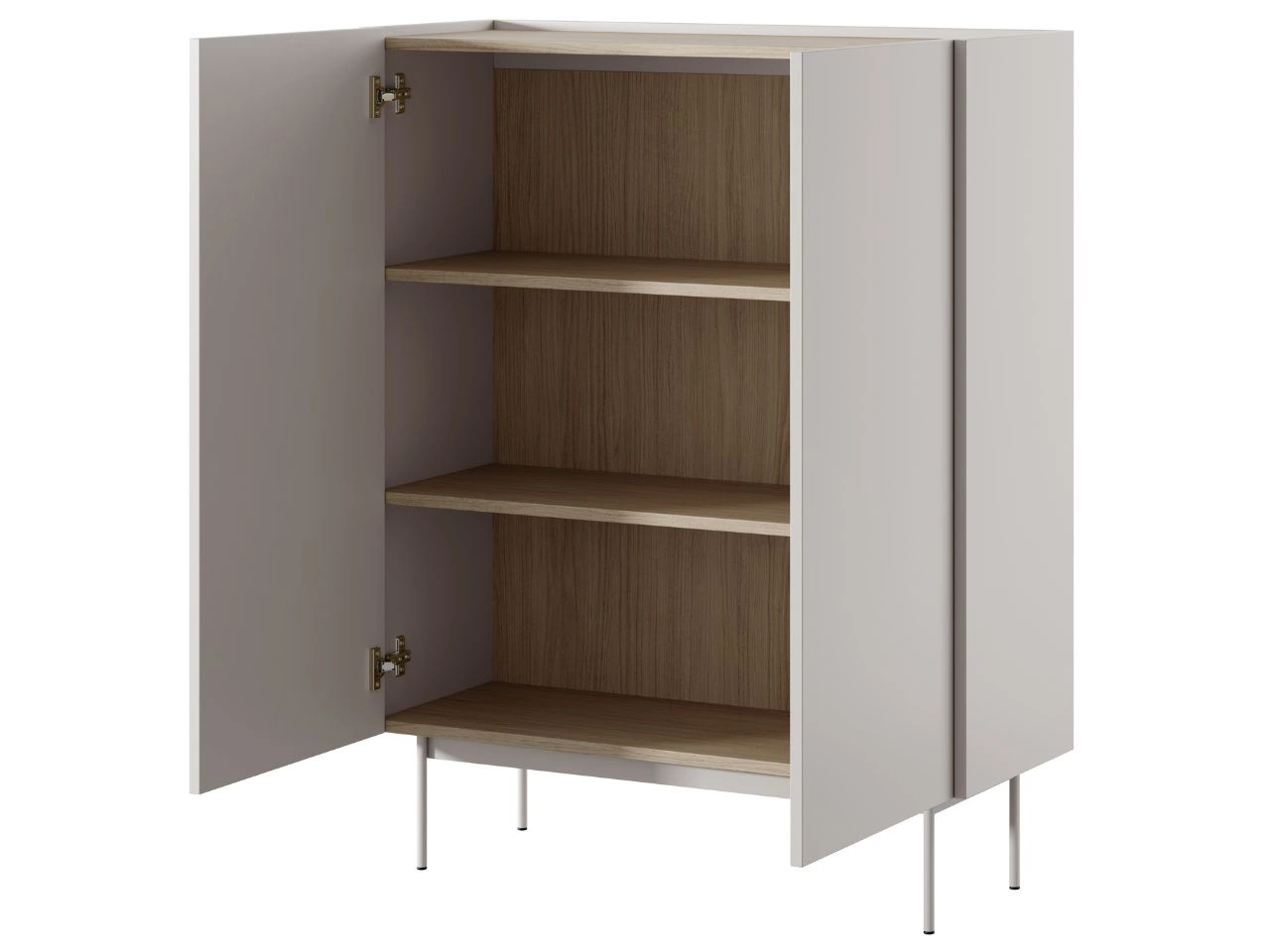 Komoda wyposażona jest w przestronne półki ukryte za zamykanymi drzwiczkami, które oferują mnóstwo miejsca na przechowywanie. Dzięki temu pozwala na utrzymanie porządku w salonie, sypialni czy jadalni, a jednocześnie stanowi elegancki element dekoracyjny.