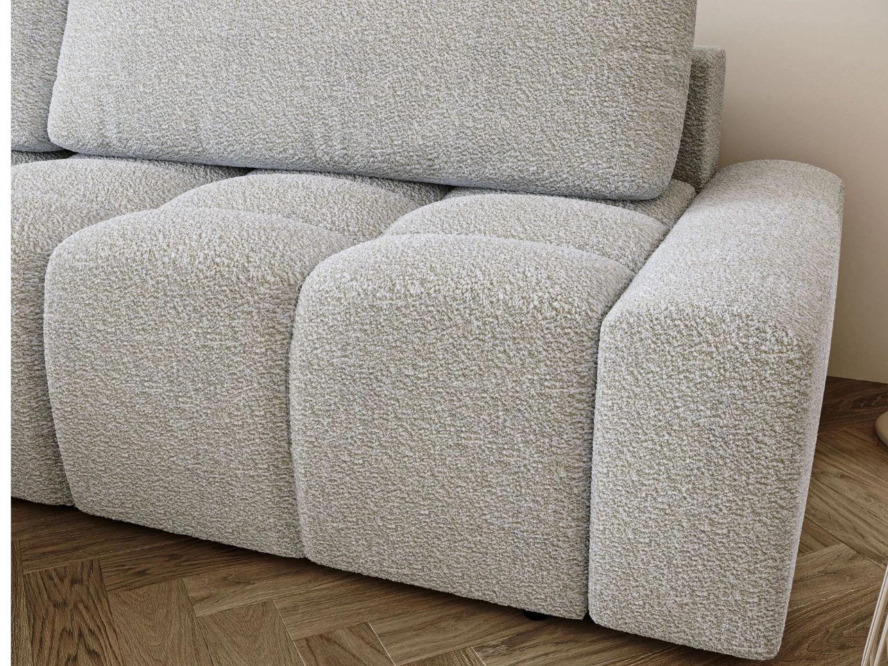 Tkanina Coral to nowoczesna tkanina meblowa typu bouclé, wyróżniająca się miękką i puszystą powierzchnią. Jej struktura jest lekko nieregularna i przypomina owczą wełnę, z widocznymi małymi pętelkami i marszczeniami. Materiał jest gęsto tkany, tworząc jednolitą i zwartą powierzchnię, bardzo komfortową i przyjemną w dotyku.