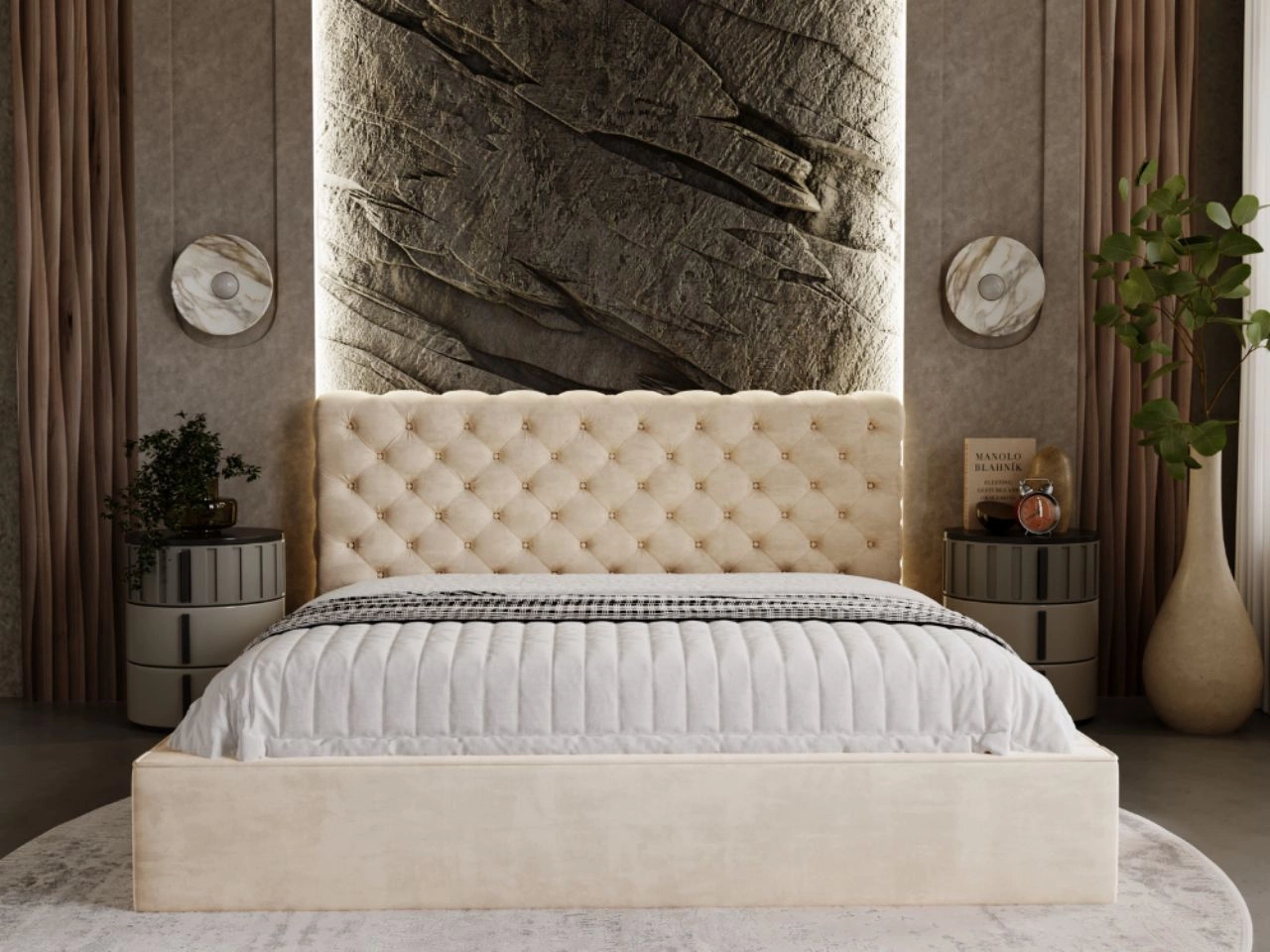 Łóżko tapicerowane Apollo to idealny wybór dla miłośników eleganckiego stylu. Posiada wysokie, pikowane wezgłowie, obite wysokiej jakości tkaniną welurową. Inspirowane stylem barokowym, łóżko Apollo jest bogato zdobione licznymi ornamentami i dodatkami. Głębokie pikowanie z guzikami dodaje mu dodatkowego uroku.