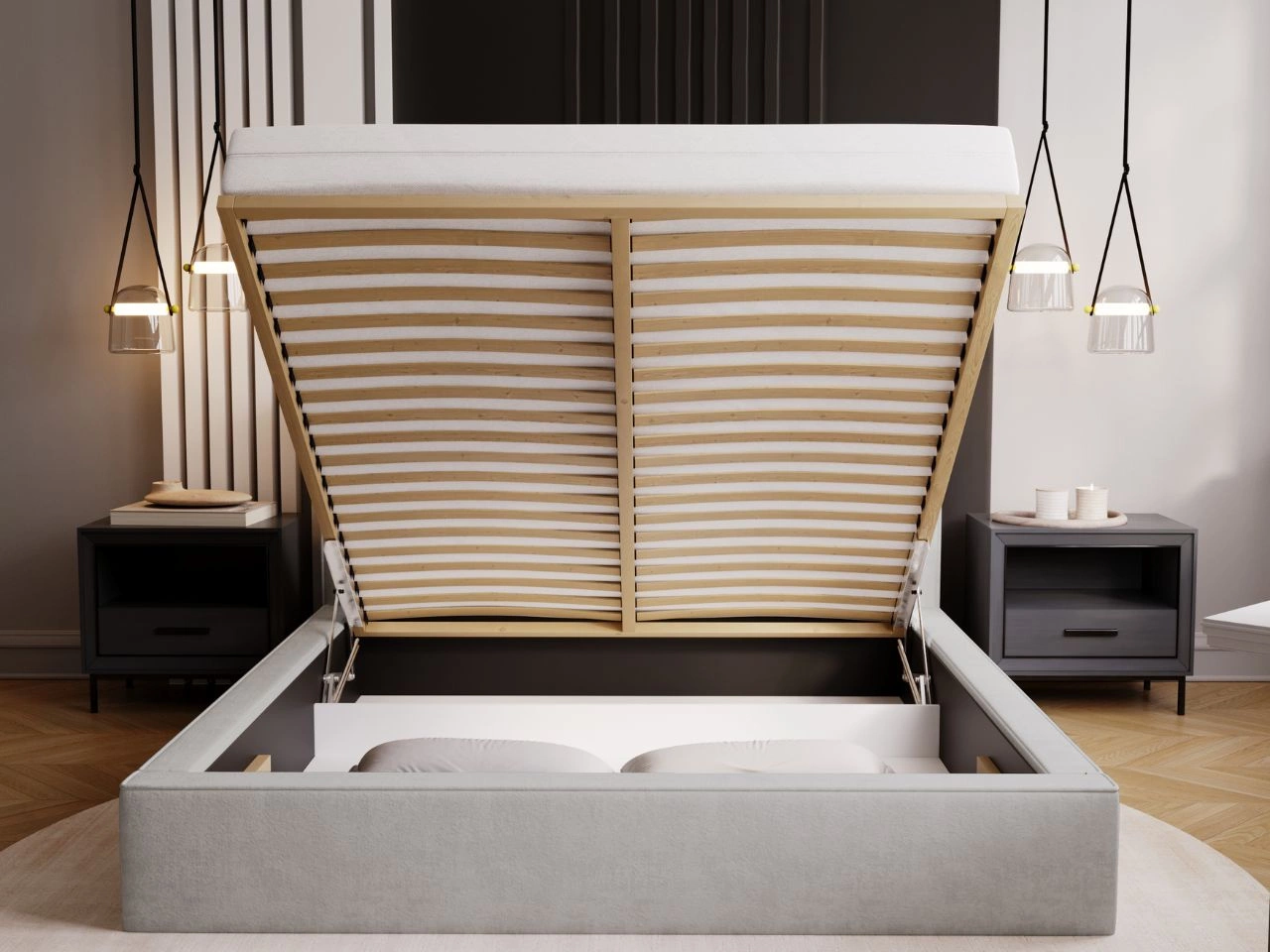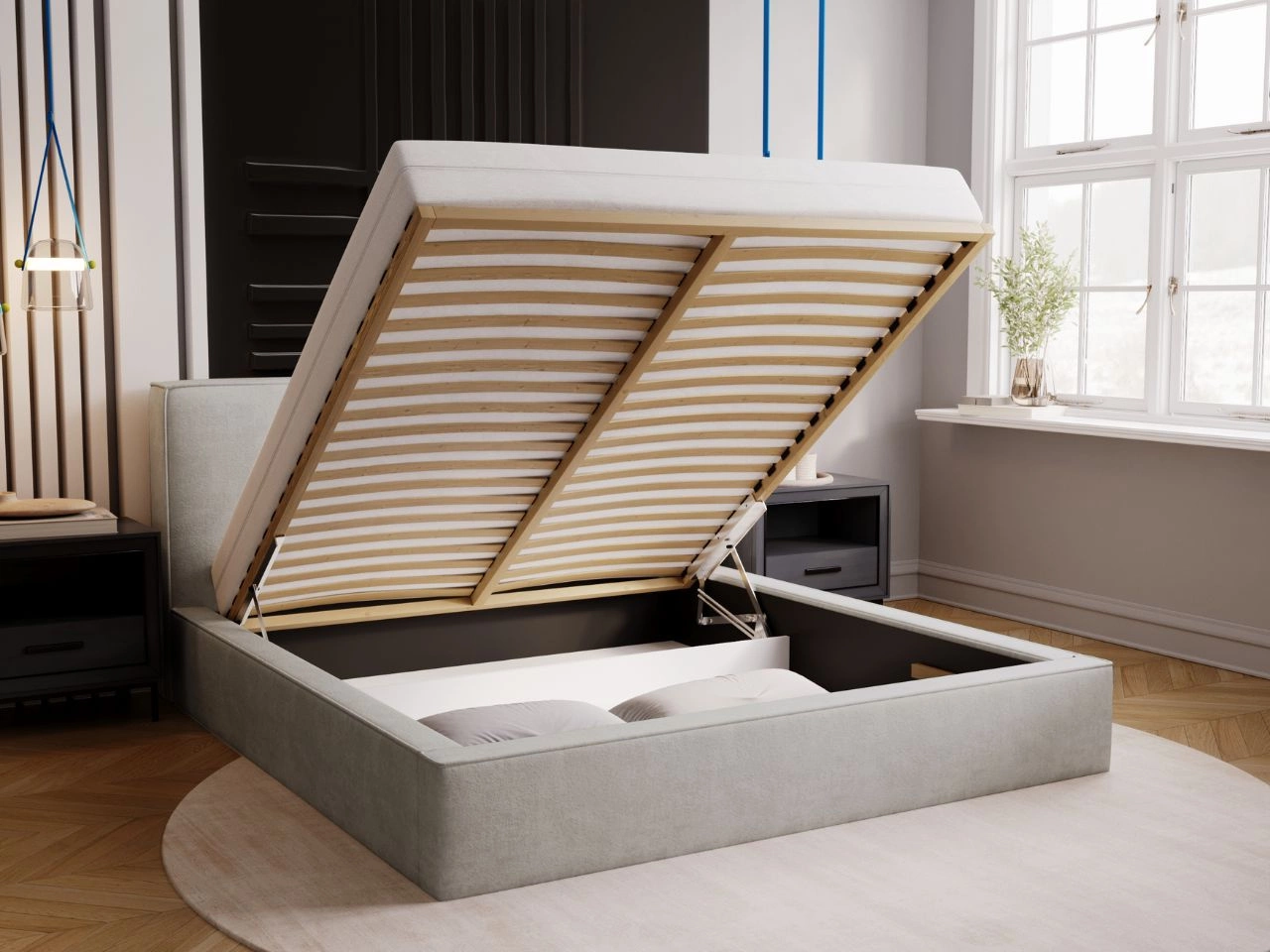 Dużą zaletą łóżka tapicerowanego Monaco jest wbudowany przestronny pojemnik na pościel, który ukryty jest pod dołączonym do zestawu drewnianym stelażem. Aby uzyskać dostęp do pojemnika, wystarczy unieść stelaż ku górze. Dzięki temu rozwiązaniu możesz przechowywać wszystkie niezbędne rzeczy w jednym miejscu.