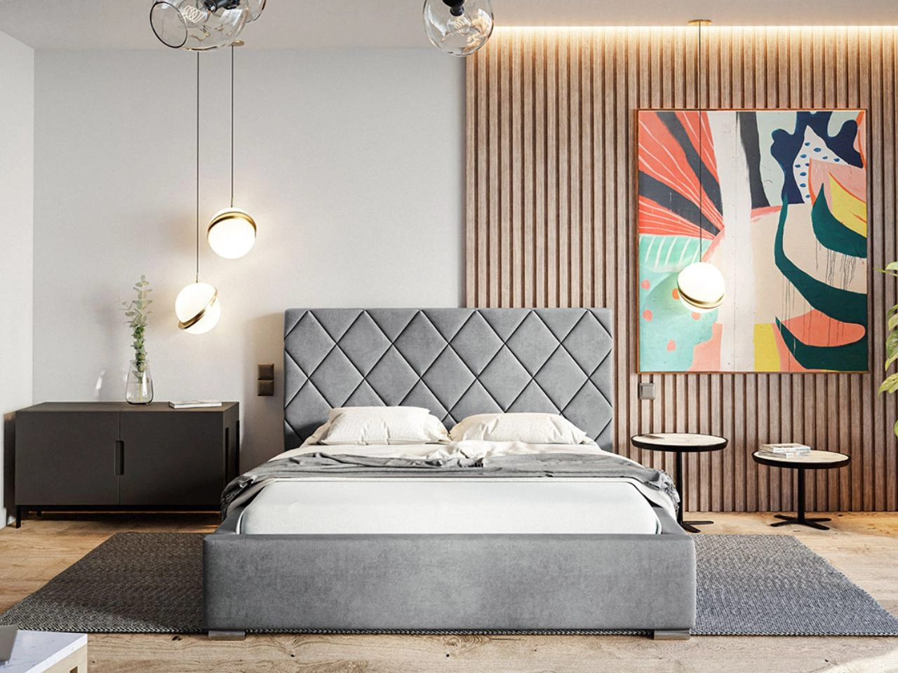 Tapicerowane łóżko podwójne Taranto to elegancki i minimalistyczny model, który zapewnia wysoki komfort oraz ergonomiczne rozwiązania. Mebel posiada wysokie wezgłowie ozdobione interesującymi przeszyciami. Wezgłowie pełni nie tylko funkcję dekoracyjną, ale także umożliwia wygodne podparcie pleców, np. podczas wieczornego czytania lub oglądania telewizji.