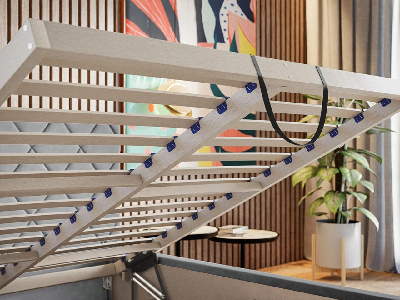 Łóżko Taranto wyposażone jest w obszerny pojemnik na pościel, do którego dostęp uzyskuje się poprzez podniesienie drewnianego stelaża od frontu. Cały proces jest bardzo prosty i nie wymaga wysiłku dzięki automatom sprężynowym wspomagającym otwieranie. Model Taranto dostępny jest w czterech różnych rozmiarach powierzchni spania: 120x200, 140x200, 160x200 oraz 180x200 cm. Łóżko sprzedawane jest bez materaca.