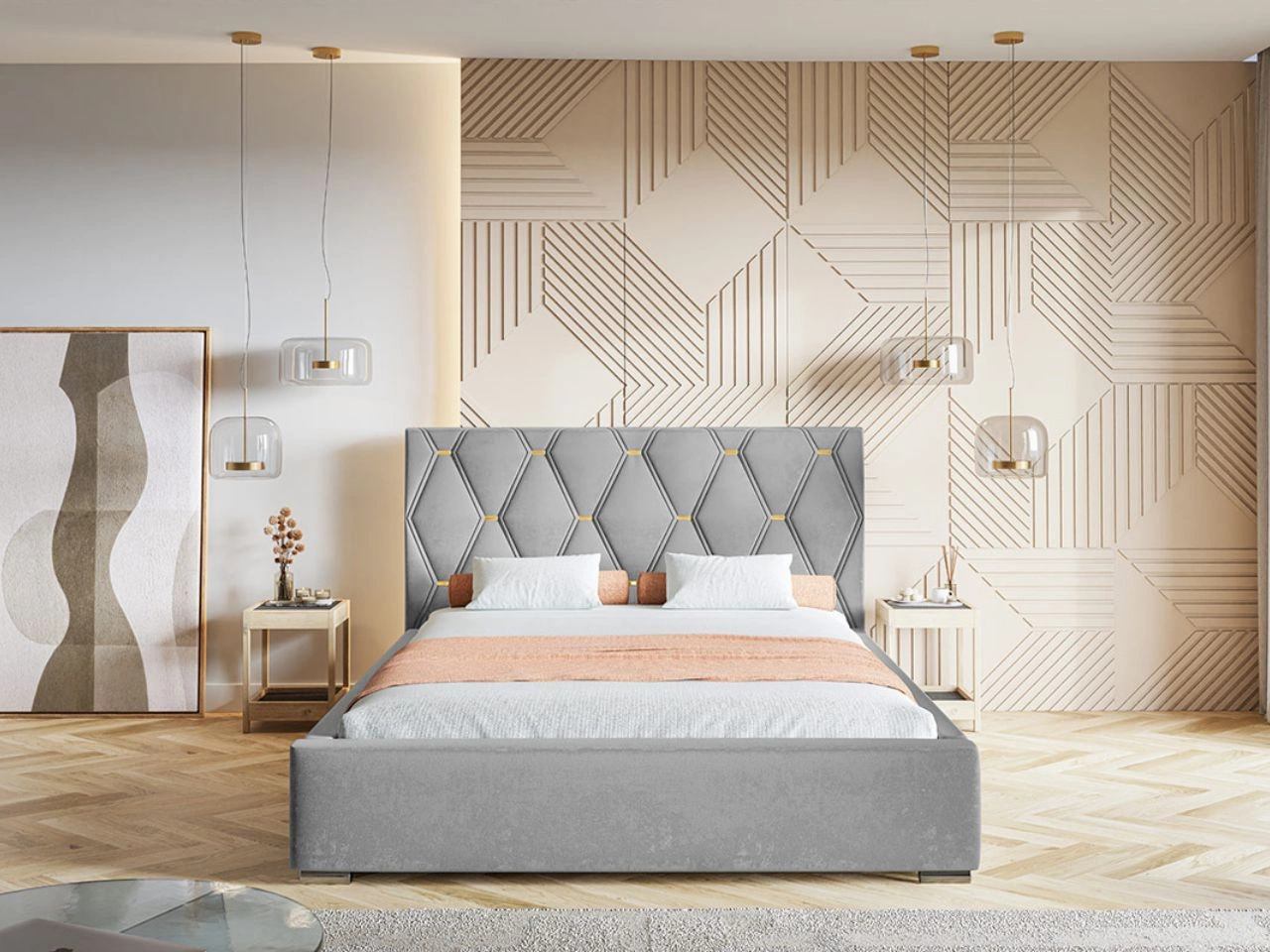 Tapicerowane łóżko Tasso to niezwykle stylowy model, w którym główną rolę odgrywa wysokie wezgłowie. Jego powierzchnia ozdobiona jest geometrycznymi przeszyciami, a w miejscach przecięć znajdują się eleganckie złote guziki. Z pewnością przypadnie do gustu zarówno miłośnikom stylu glamour, jak i zwolennikom nowoczesnych aranżacji.