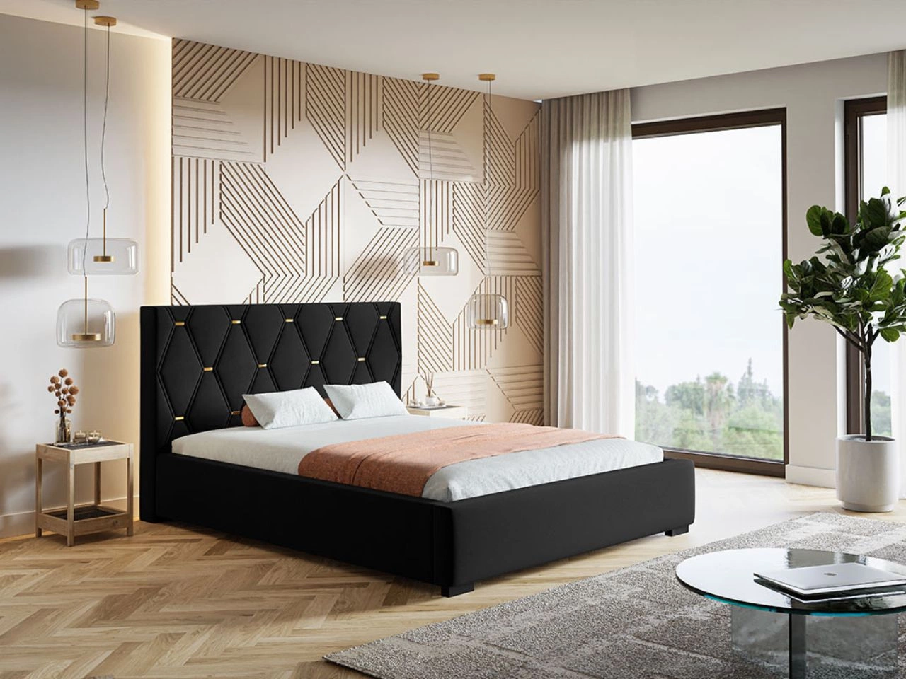 Tapicerowane łóżko Tasso to niezwykle stylowy model, w którym główną rolę odgrywa wysokie wezgłowie. Jego powierzchnia ozdobiona jest geometrycznymi przeszyciami, a w miejscach przecięć znajdują się eleganckie złote guziki. Z pewnością przypadnie do gustu zarówno miłośnikom stylu glamour, jak i zwolennikom nowoczesnych aranżacji.