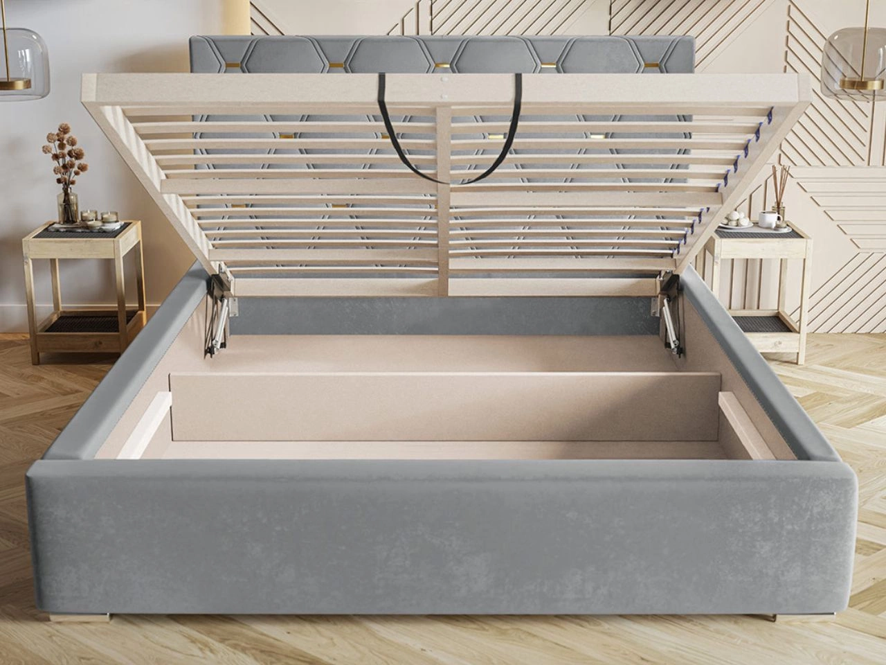 Dwuosobowe łóżko Tasso wyposażone jest w przestronny pojemnik na pościel, który otwierany jest poprzez uniesienie drewnianego stelaża od frontu do góry (stelaż jest w zestawie). Automaty sprężynowe wspomagają otwieranie, dzięki czemu cały proces jest niemal bezwysiłkowy. To doskonały wybór dla wymagających klientów, którzy cenią piękno i doskonałe wykonanie. Model dostępny jest w rozmiarach 120 × 200, 140 × 200, 160 × 200, 180 × 200 cm, dzięki czemu sprawdzi się zarówno w mniejszych, jak i przestronnych sypialniach.