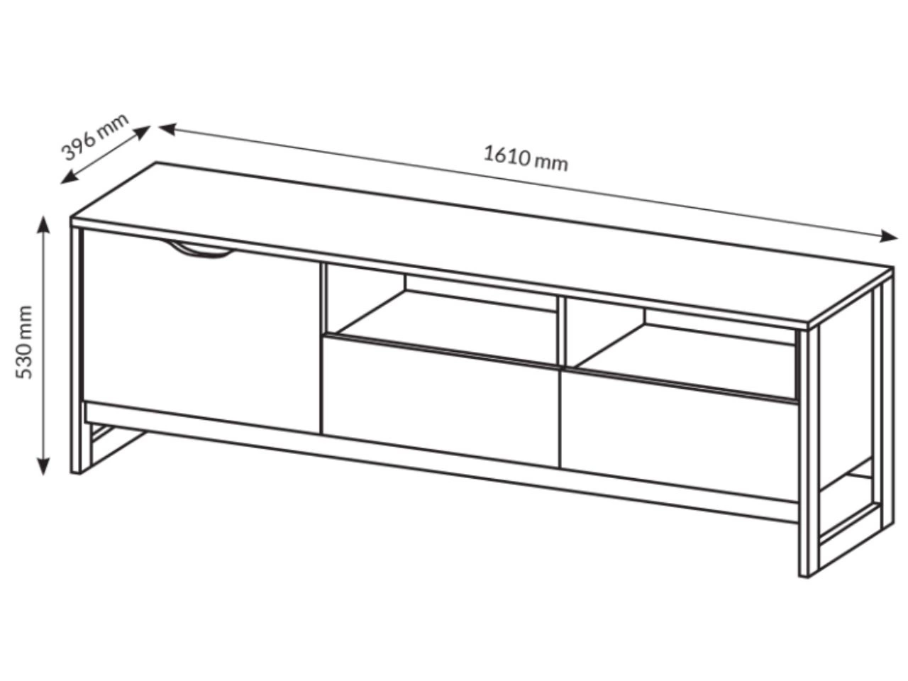 Stolik TV posiada liczne funkcjonalne cechy, takie jak przestronny schowek, który pomieści akcesoria multimedialne, gry czy kable, oraz dwie pojemne szuflady na drobne przedmioty. Dwa otwarte schowki zapewniają miejsce na urządzenia, takie jak dekodery czy konsole, a metalowa rama gwarantuje stabilność mebla, odpowiedniego zarówno dla lekkich, jak i cięższych telewizorów. Dzięki eleganckim nogom, które zmniejszają ryzyko zarysowań podłogi, oraz łatwej w utrzymaniu powierzchni z płyty wiórowej pokrytej laminatem, stolik TV Denis to funkcjonalny i stylowy element, który wnosi harmonię i nowoczesny charakter do każdego wnętrza.