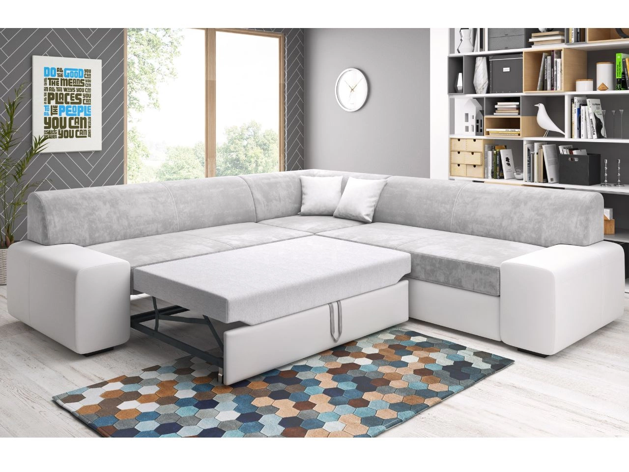 Narożnik w kształcie L to doskonałe uzupełnienie nowoczesnego wnętrza. Siedzisko wypełnione jest sprężynami bonellowymi oraz pianką, co sprawia, że po rozłożeniu powstaje równa i wygodna powierzchnia, zapewniająca maksymalny komfort wypoczynku.