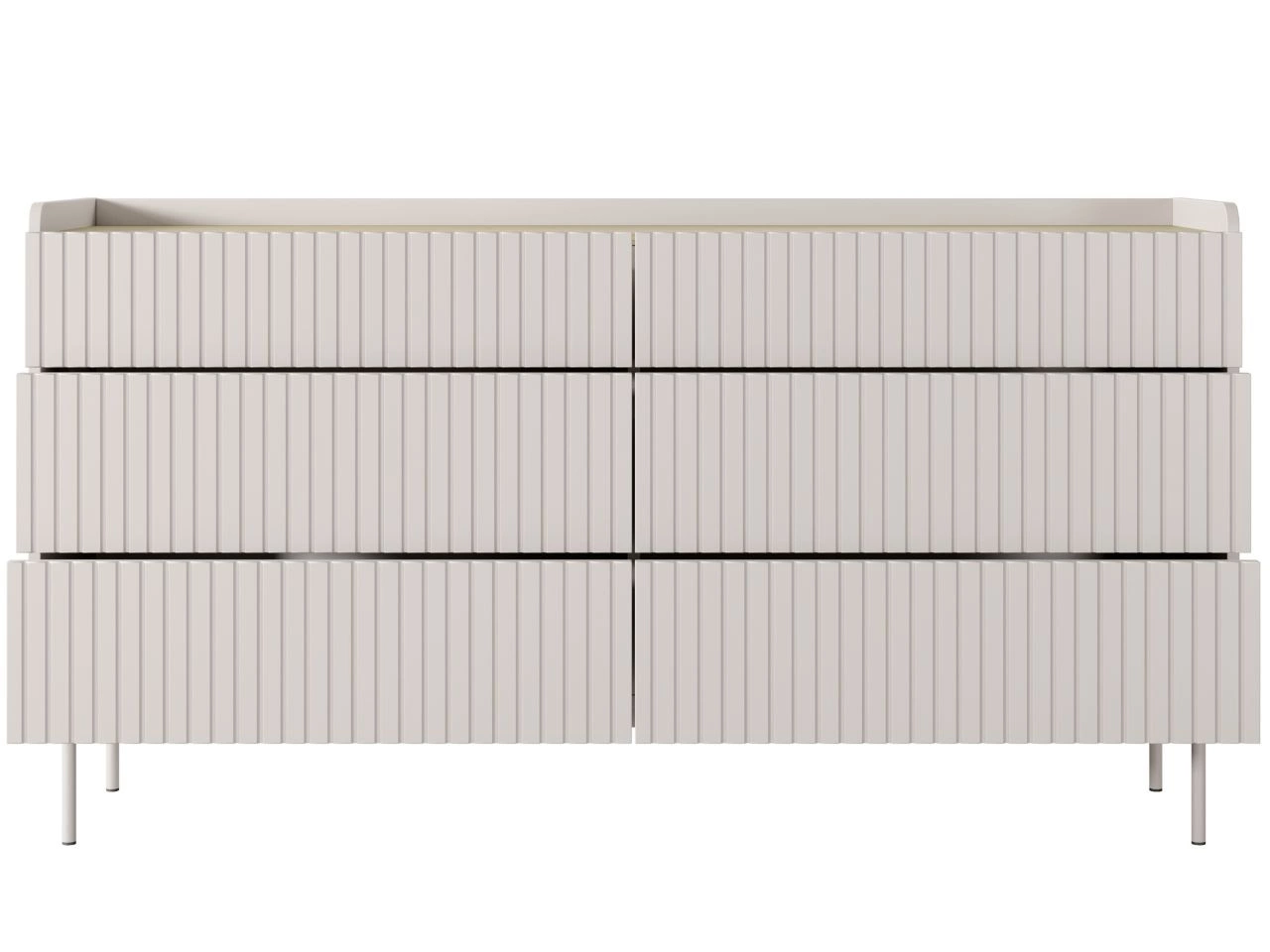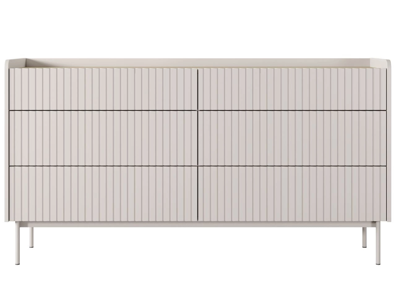 Komoda Abios została wykonana z wysokiej jakości materiałów, co gwarantuje jej trwałość i niezawodność. Korpus w eleganckim beżowym odcieniu, wykonany z laminowanej płyty o grubości 16 mm, harmonijnie komponuje się z całością. Krawędzie zabezpieczone materiałem ABS zwiększają odporność na uszkodzenia, a staranne wykończenie podkreśla ekskluzywny charakter mebla.