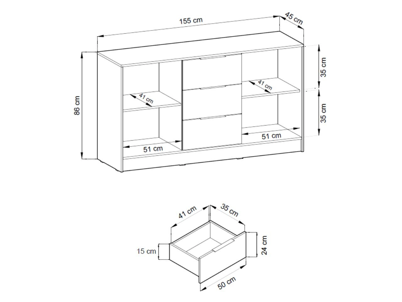 Dzięki trzem pojemnym szufladom oraz półkom ukrytym za drzwiami, komoda Macron oferuje mnóstwo miejsca do przechowywania, co pozwala na łatwe uporządkowanie ubrań, akcesoriów i innych drobiazgów.