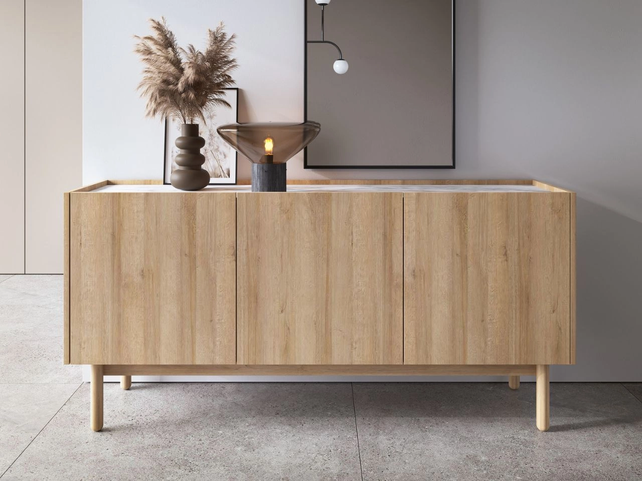 Każdy mebel z kolekcji Braha posiada delikatne, drewniane nóżki o wysokości 20 cm, które nadają całej konstrukcji subtelności i lekkości oraz ułatwiają organizację przestrzeni pod meblem. Korpus i fronty wykonane z wysokiej jakości płyty laminowanej o grubości 16 mm gwarantują trwałość i odporność na codzienne użytkowanie oraz podkreślają naturalny urok dębu Riviera w połączeniu z eleganckim panelem akcentowym z marmuru Bianco. Obróbka krawędzi ABS nie tylko wzmacnia konstrukcję, ale także zapewnia ochronę przed ewentualnymi uszkodzeniami mechanicznymi.