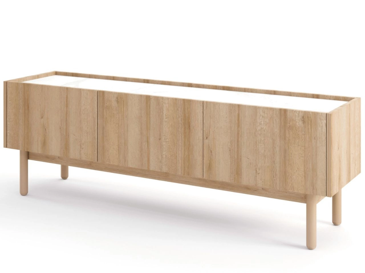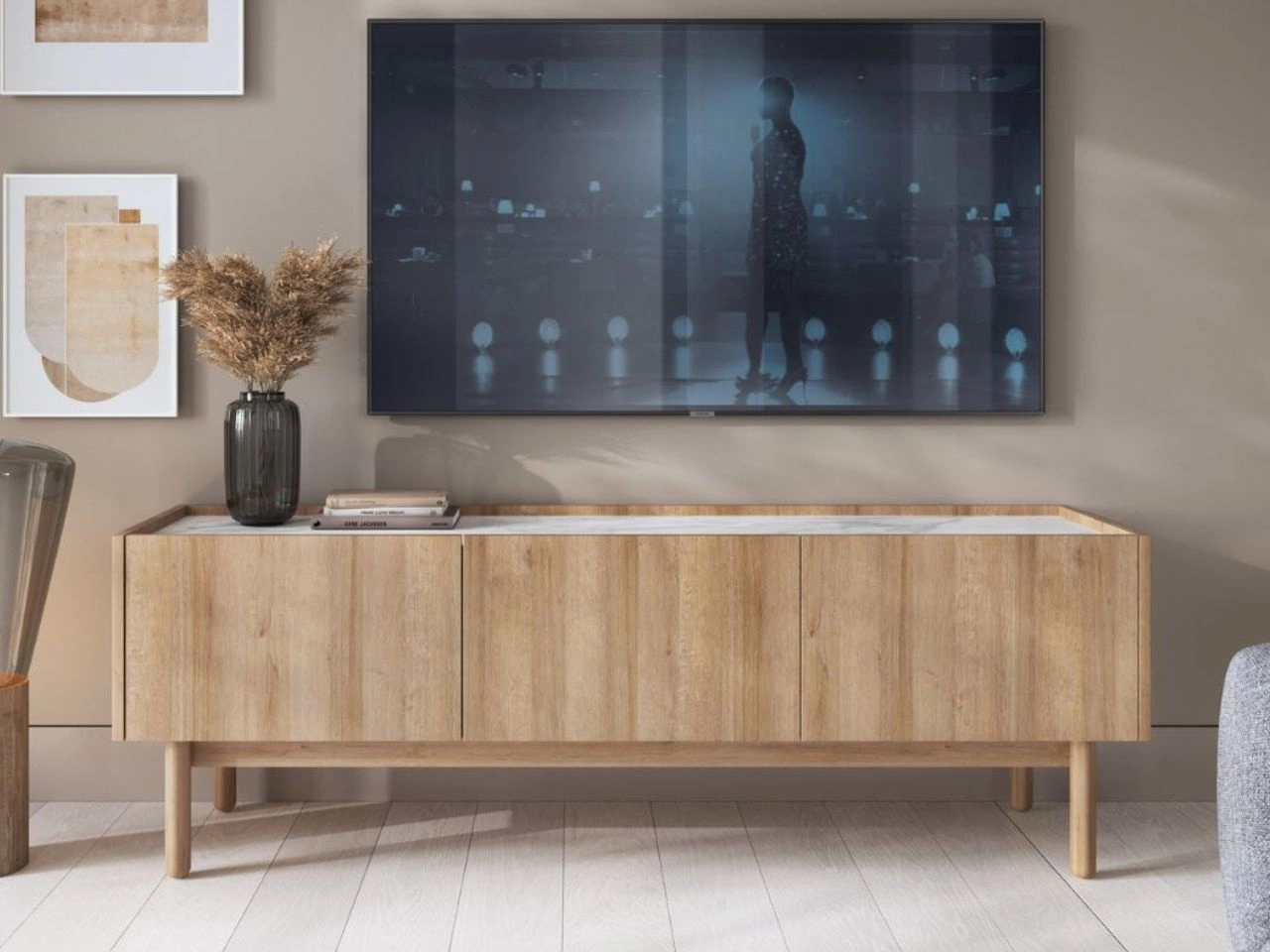 Szafka RTV to niska, a zarazem szeroka konstrukcja idealna do umieszczenia sprzętu elektronicznego, posiada trzy skrzydła drzwiowe i blat w kolorze marmuru bianco.