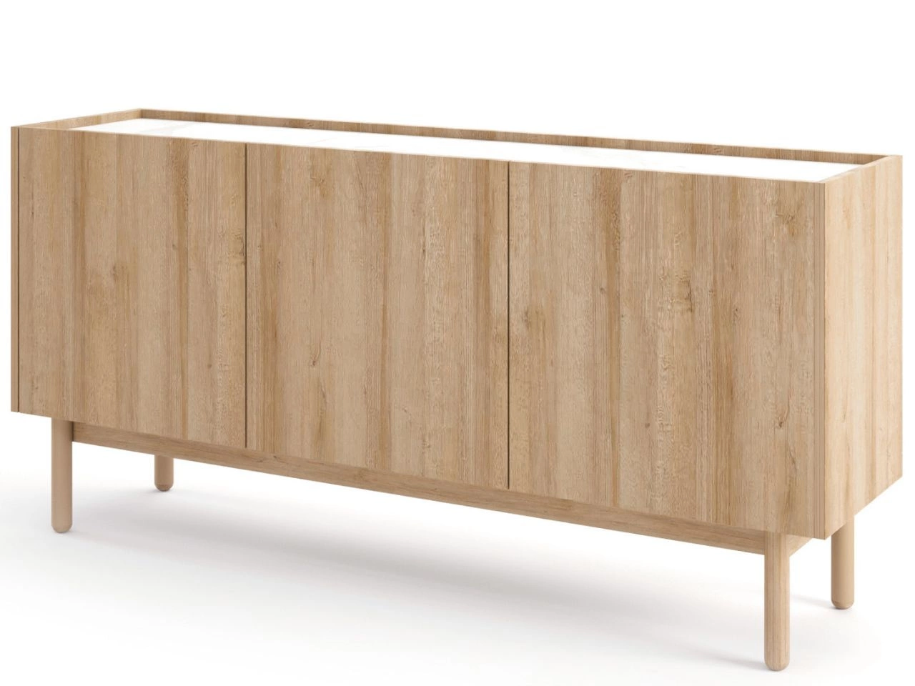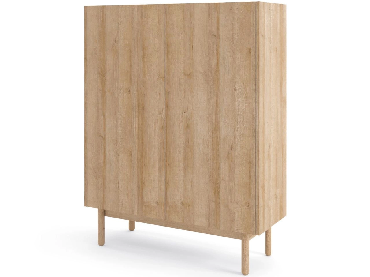 Zarówno niższa jak i wyższa komoda są duże i przestronne, składają się kolejno z trzech i dwóch frontów bez uchwytów, ustawiona na smukłych, drewnianych nóżkach, świetnie sprawdzą się do przechowywania większej ilości rzeczy – mogą służyć jako kredens lub szafka na tekstylia.