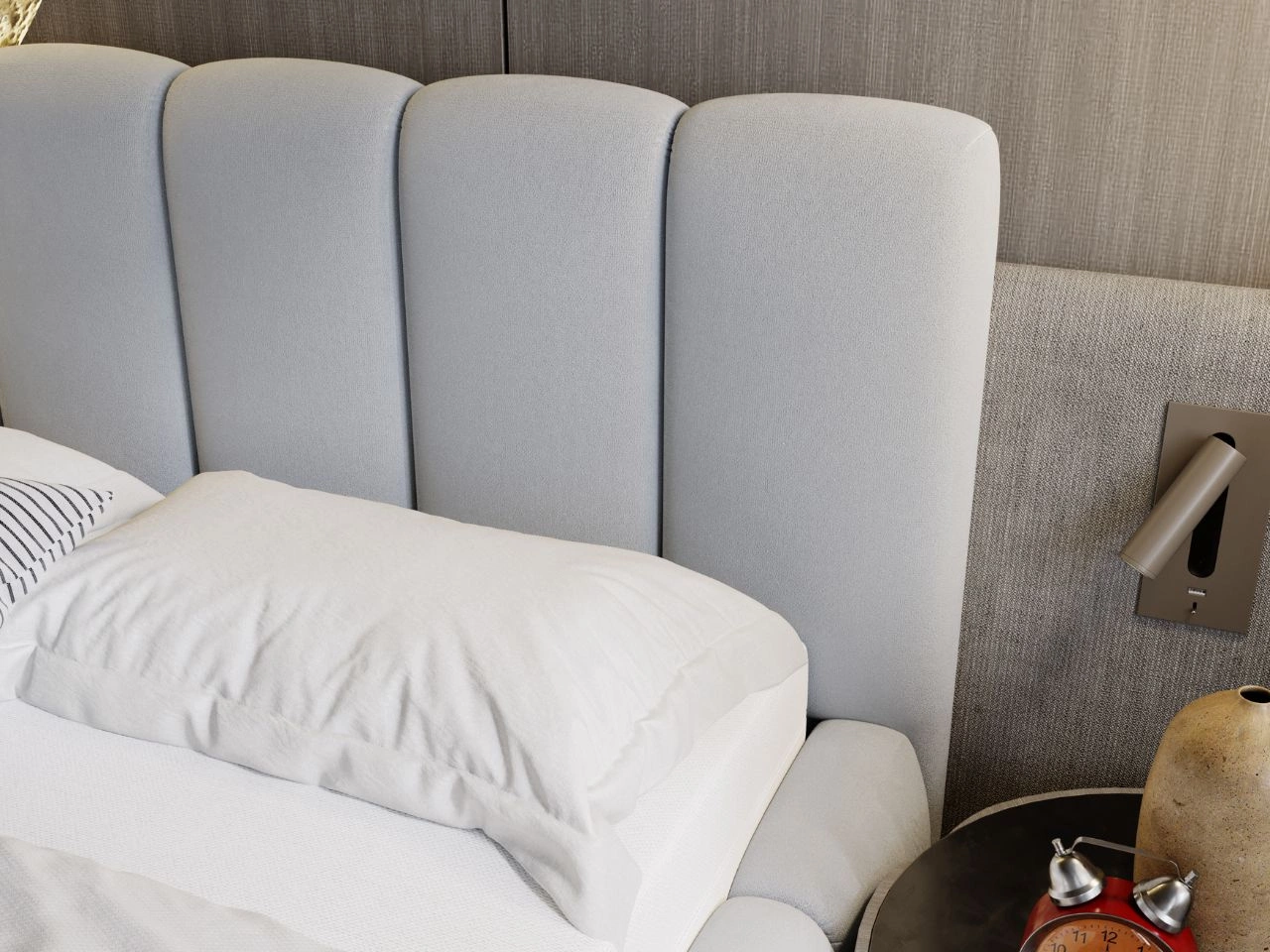 Łóżko tapicerowane Cloud w pierwszej kolejności przyciąga wzrok swoim wysokim wezgłowiem, które wraz z masywną skrzynią tworzy bardzo harmonijną kompozycję. Wezgłowie zostało ozdobione pionowymi przeszyciami, a dzięki zastosowaniu miękkiego wykończenia, będzie idealną podporą dla naszych pleców, kiedy będziemy na przykład czytać książkę.