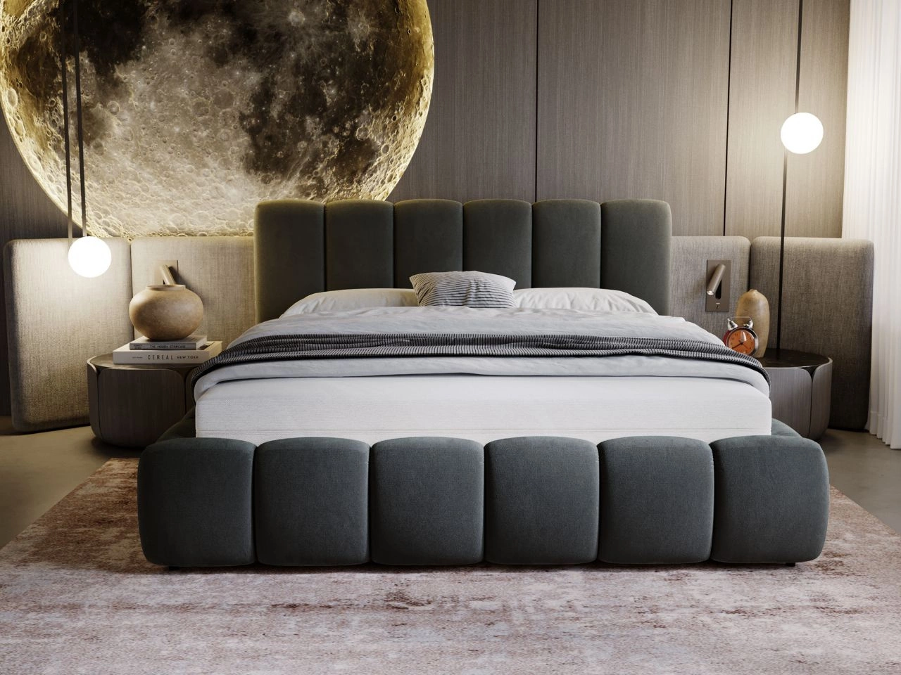 Łóżko tapicerowane Cloud w pierwszej kolejności przyciąga wzrok swoim wysokim wezgłowiem, które wraz z masywną skrzynią tworzy bardzo harmonijną kompozycję. Wezgłowie zostało ozdobione pionowymi przeszyciami, a dzięki zastosowaniu miękkiego wykończenia, będzie idealną podporą dla naszych pleców, kiedy będziemy na przykład czytać książkę.
