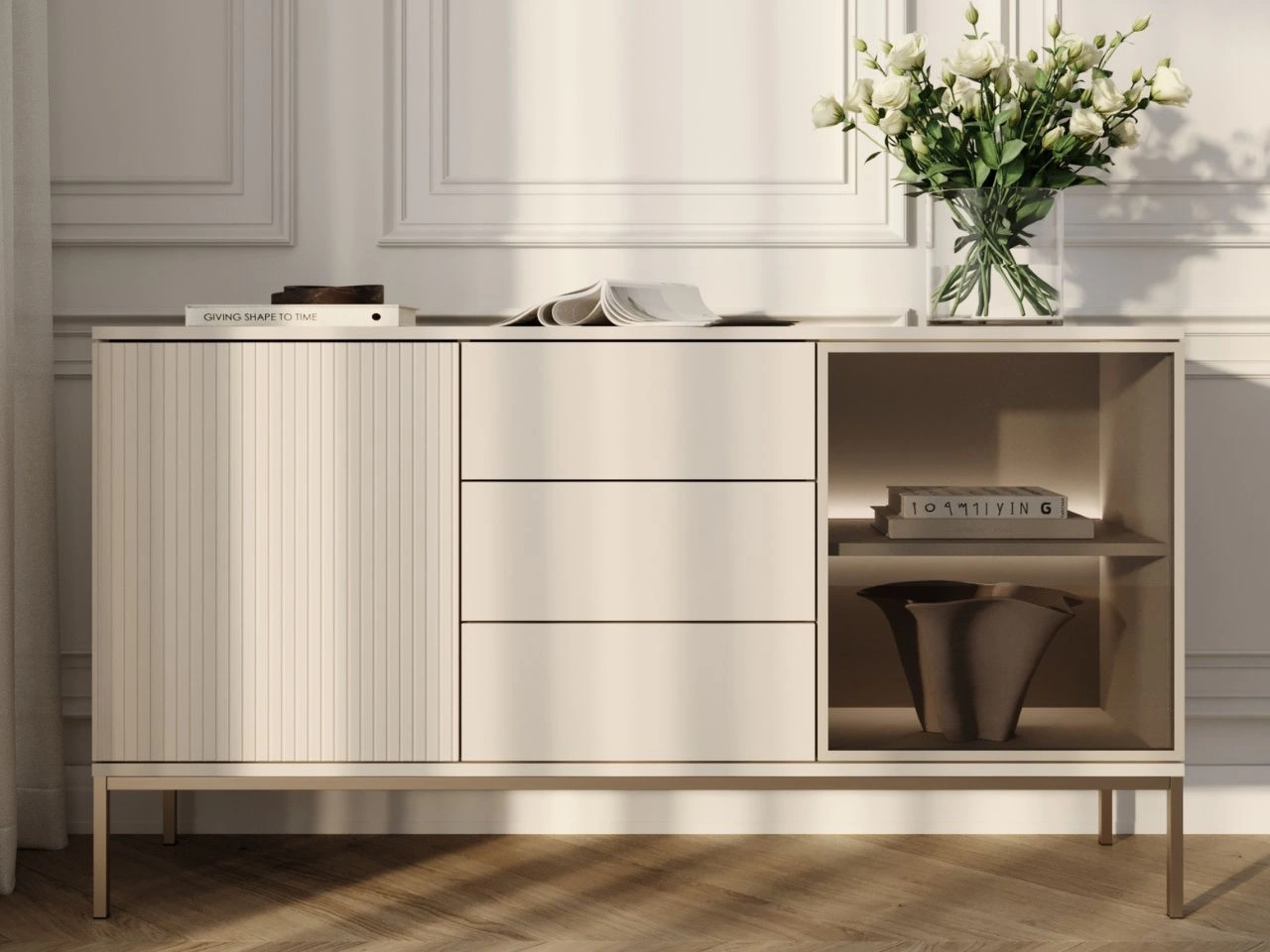 Komoda w stylu loft do salonu Deo łączy styl z praktycznością. Kolor kaszmirowy oraz oświetlenie LED sprawiają, że jest ona idealnym uzupełnieniem nowoczesnego wystroju wnętrza.