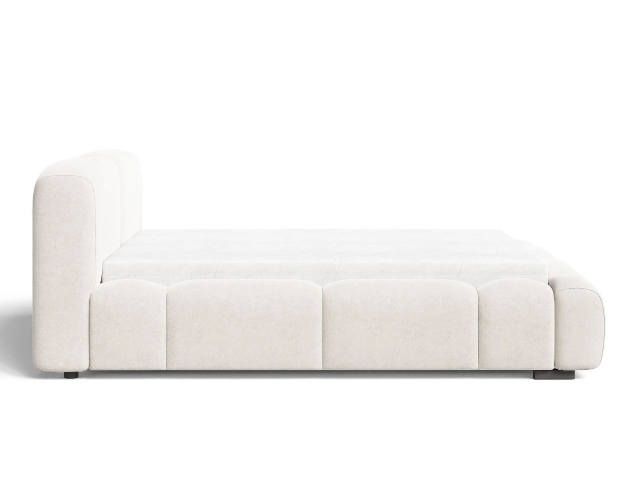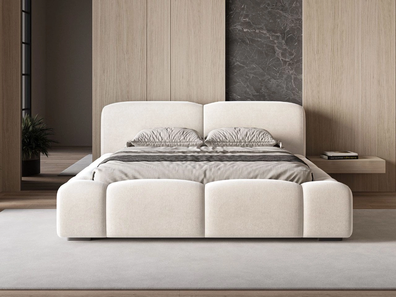 Łóżko tapicerowane Aubi to nowoczesny mebel o rzeźbiarskiej formie, który wyróżnia się lekko zaokrągloną bryłą i masywną podstawą. Jego miękkie boczne elementy i minimalistyczne, dwuczęściowe wezgłowie idealnie komponują się z eleganckimi, współczesnymi wnętrzami.