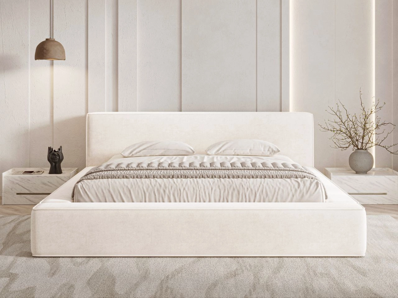 Dwuosobowe łóżko Mali wyposażono w szerokie, tapicerowane wezgłowie o prostej formie, które pełni rolę zarówno dekoracyjną, jak i praktyczną. Zapewnia wygodne podparcie pleców podczas wieczornego relaksu, a dzięki swojej szerokości może służyć jako dodatkowa powierzchnia do odłożenia telefonu, książki czy okularów. To funkcjonalny detal, który podkreśla nowoczesny charakter mebla.