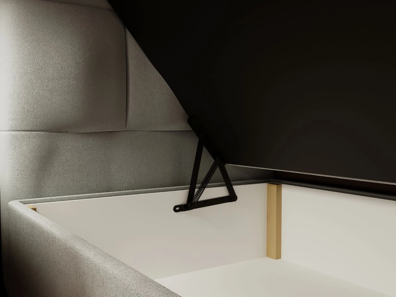 Praktyczny dwudzielny pojemnik na pościel pozwala na wygodne przechowywanie kołder, poduszek lub ubrań sezonowych. Sprężynowy mechanizm unoszenia ułatwia dostęp do schowka bez konieczności użycia siły.