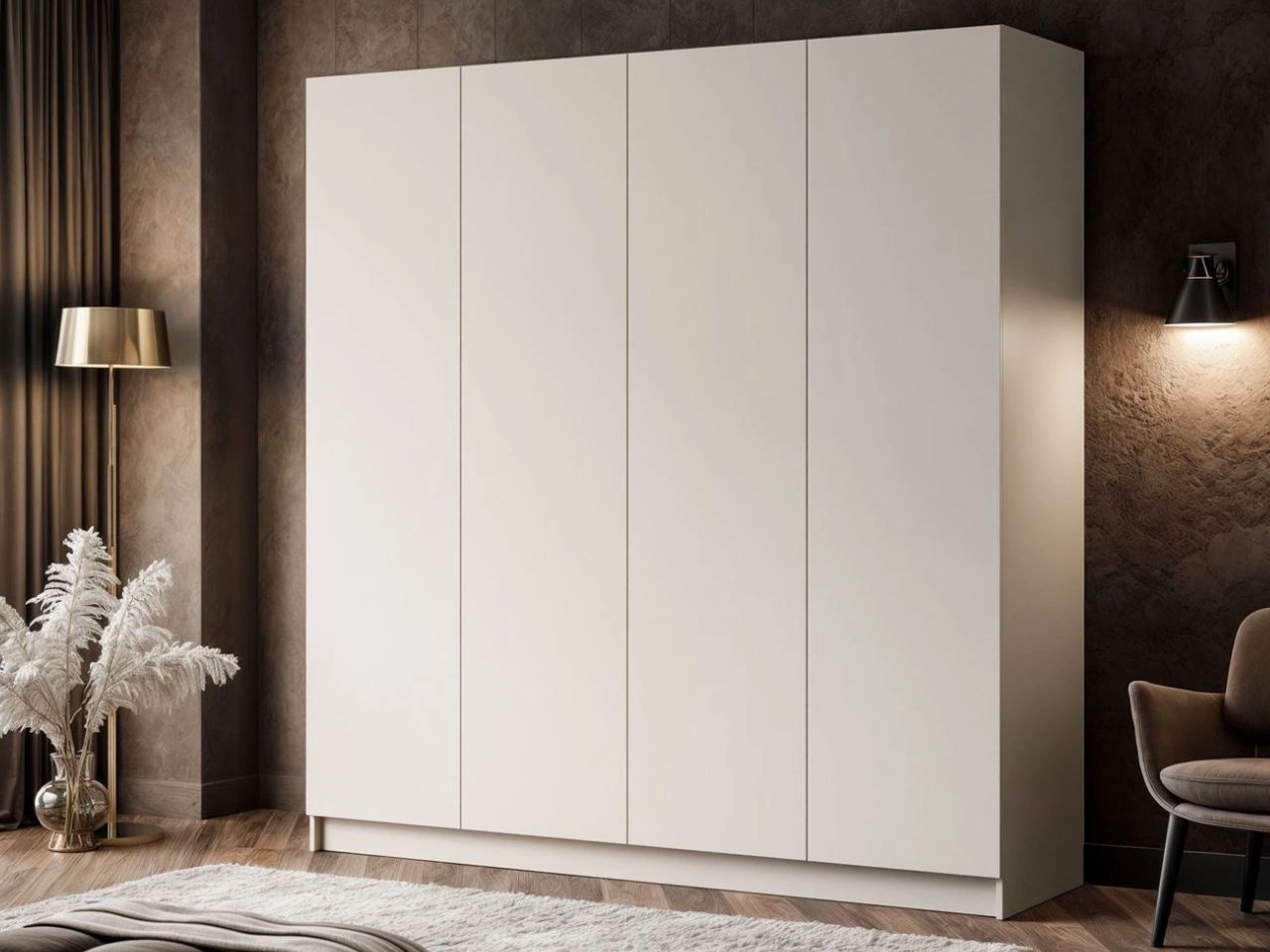 Czterodrzwiowa szafa Ameli posiada korpus wykonany z wysokiej jakości laminowanej płyty meblowej w neutralnym, kaszmirowym kolorze, który doskonale współgra z gładkimi, matowymi frontami tworząc spójną, stonowaną całość. Szafa posiada nowoczesny system otwierania PUSH TO OPEN, który pozwala otworzyć szafę lekkim naciśnięciem frontu, bez użycia uchwytów. Mechanizm sprężynowy wypycha front do przodu, a ponowne dociśnięcie zamyka i blokuje mebel dodając mu jednocześnie nowoczesnego charakteru i wytwornego wyglądu dzięki usunięciu uchwytów. Krawędzie szafy zostały wykończone okleiną ABS, która chroni je przed uszkodzeniami, wilgocią i ścieraniem, zapewniając trwałość i estetyczny wygląd mebla na dłużej.