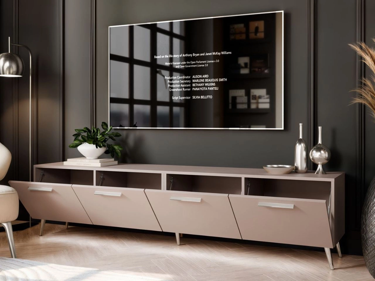 Szafka RTV pod telewizor z drzwiczkami i oświetleniem LED na srebrnych nóżkach 200 cm Noaé Kaszmir