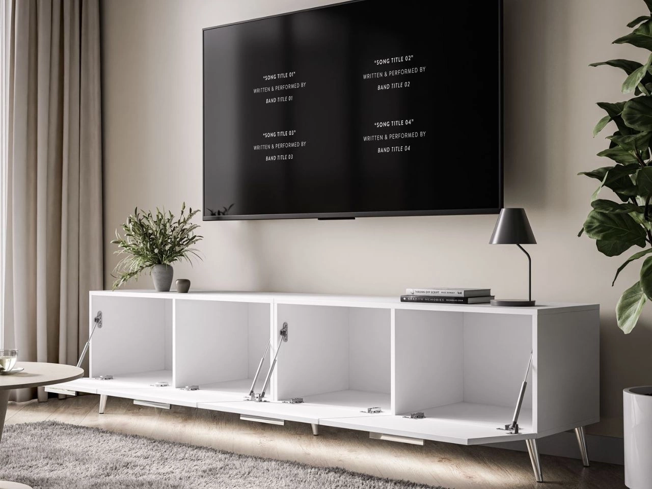 Front szafki telewizyjnej wykonano z płyty pokrytej akrylem, który nadaje powierzchni elegancki wysoki połysk i zwiększa odporność na zarysowania . Subtelne uchwyty umożliwiają wygodne otwieranie frontów, zachowując jednocześnie nowoczesny charakter mebla i jego gładką, minimalistyczną formę. Całość opiera się na wysokich, smukłych i skośnych metalowych nogach, które dodają konstrukcji wizualnej lekkości, ułatwiają utrzymanie porządku oraz umożliwiają praktyczne wykorzystanie przestrzeni pod meblem.