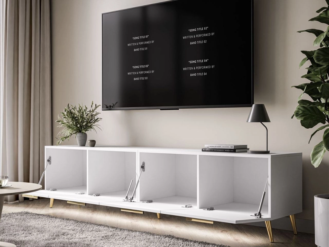 Front szafki telewizyjnej wykonano z płyty pokrytej akrylem, który nadaje powierzchni elegancki wysoki połysk i zwiększa odporność na zarysowania . Subtelne uchwyty umożliwiają wygodne otwieranie frontów, zachowując jednocześnie nowoczesny charakter mebla i jego gładką, minimalistyczną formę. Całość opiera się na wysokich, smukłych i skośnych metalowych nogach, które dodają konstrukcji wizualnej lekkości, ułatwiają utrzymanie porządku oraz umożliwiają praktyczne wykorzystanie przestrzeni pod meblem.