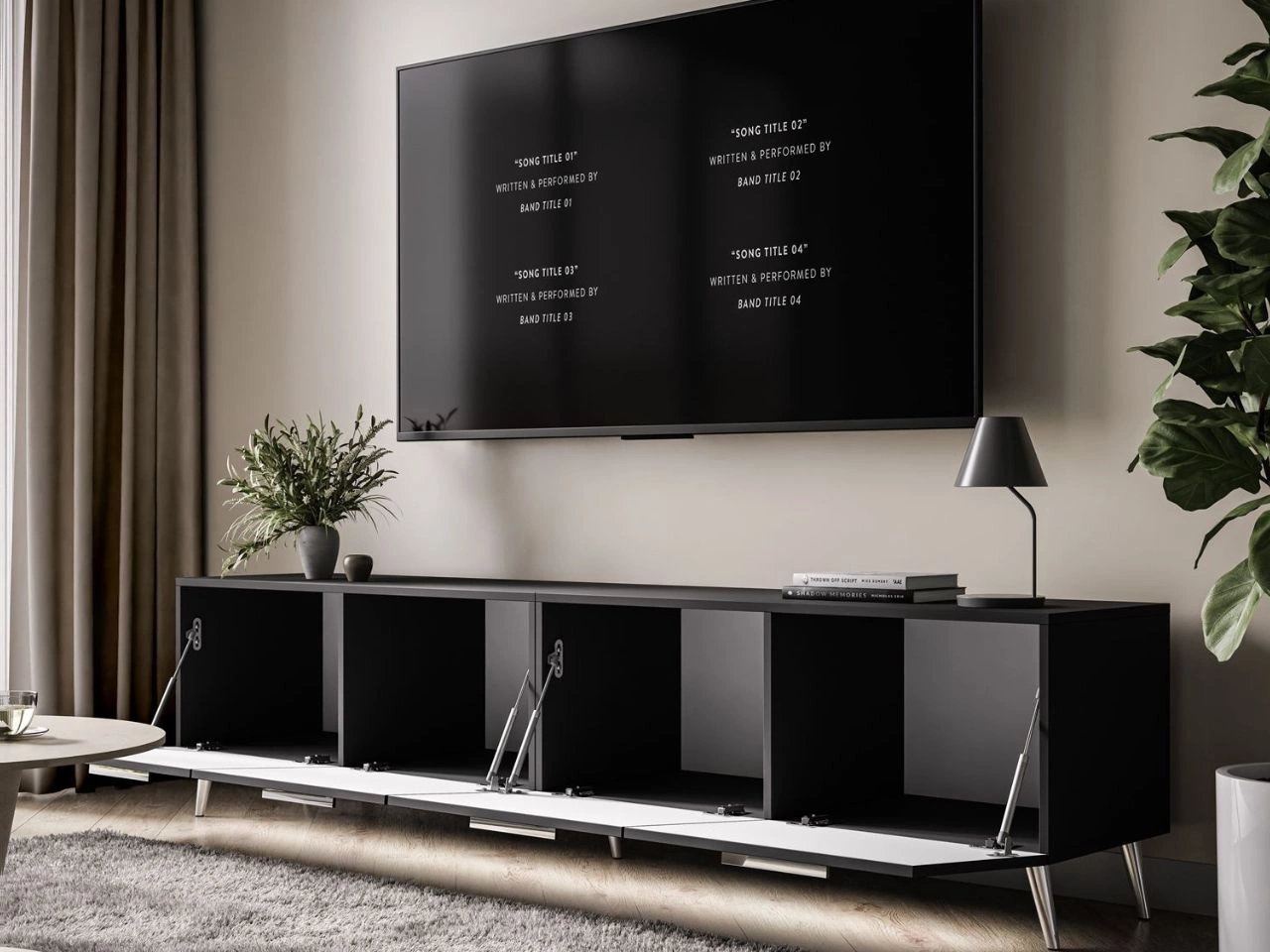 Front szafki telewizyjnej wykonano z płyty pokrytej akrylem, który nadaje powierzchni elegancki wysoki połysk i zwiększa odporność na zarysowania . Subtelne uchwyty umożliwiają wygodne otwieranie frontów, zachowując jednocześnie nowoczesny charakter mebla i jego gładką, minimalistyczną formę. Całość opiera się na wysokich, smukłych i skośnych metalowych nogach, które dodają konstrukcji wizualnej lekkości, ułatwiają utrzymanie porządku oraz umożliwiają praktyczne wykorzystanie przestrzeni pod meblem.