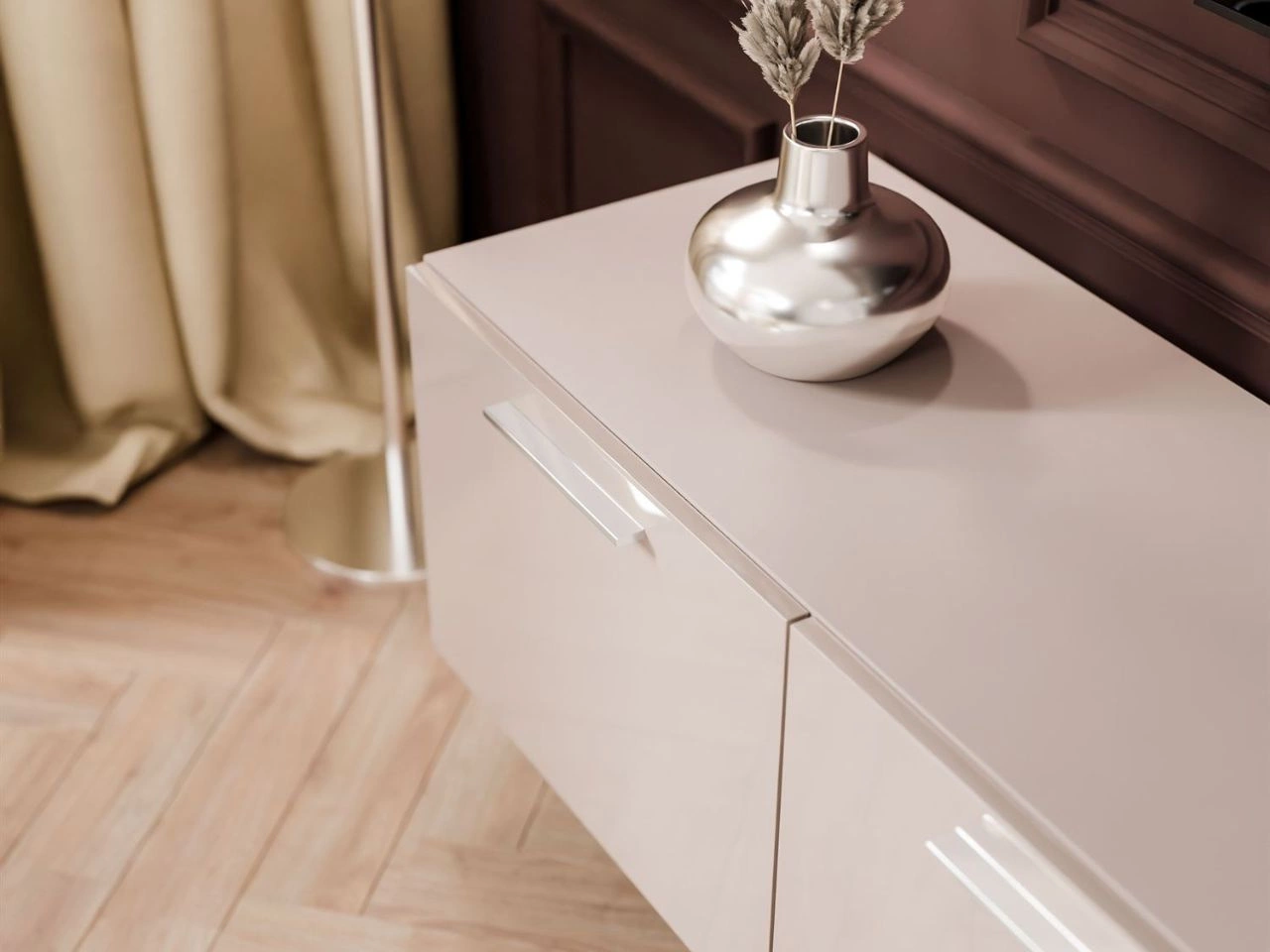 Front telewizyjnej szafki wykonano z płyty pokrytej akrylem, który nadaje jej powierzchni elegancki wysoki połysk i zwiększa odporność na zarysowania. Delikatne uchwyty zapewniają wygodę w otwieraniu frontów, jednocześnie podkreślając nowoczesny styl mebla i jego prostą, minimalistyczną linię. Model został zaprojektowany jako mebel wiszący, co pozwala efektywnie zagospodarować przestrzeń i nadaje wnętrzu lekkości oraz nowoczesnego charakteru.