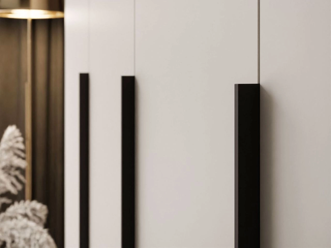 Szafy Ameli oferują kilka wariantów wykończenia frontów: z uchwytami w kolorze czarnym lub złotym albo w wersji bez uchwytów z systemem push to open, który pozwala otworzyć drzwi lekkim naciśnięciem frontu, a sprężynowy mechanizm delikatnie je wysuwa – idealne rozwiązanie dla minimalistycznych wnętrz.