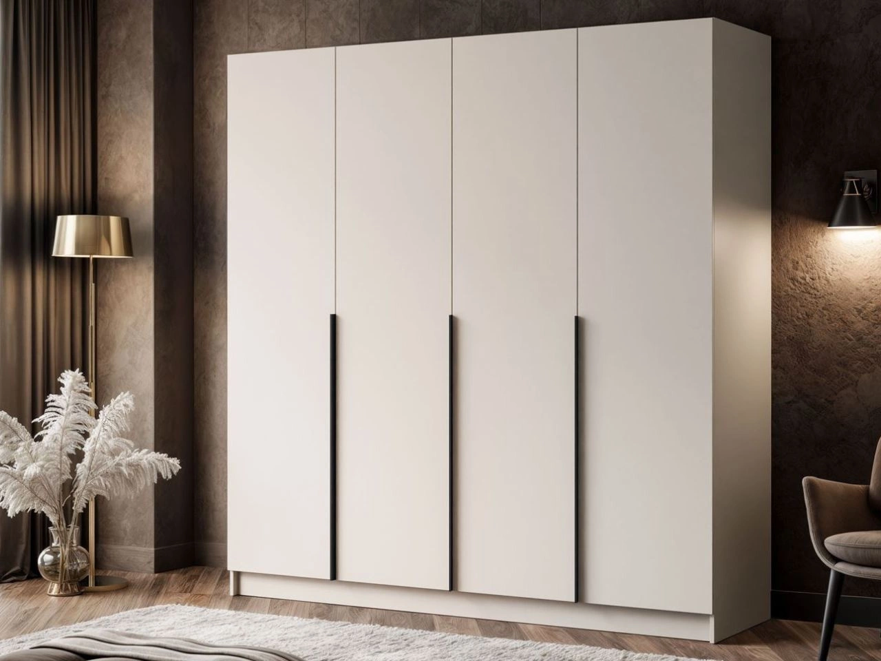Czterodrzwiowa szafa Ameli posiada korpus wykonany z wysokiej jakości laminowanej płyty meblowej w neutralnym, kaszmirowym kolorze doskonale współgra z gładkimi, matowymi frontami, tworząc spójną, stonowaną całość. Długie, pionowe uchwyty w czarnym kolorze dodają meblowi nowoczesnego charakteru i wytwornego wyglądu, jednocześnie podkreślając jego smukłą formę. Krawędzie szafy zostały wykończone okleiną ABS, która chroni je przed uszkodzeniami, wilgocią i ścieraniem, zapewniając trwałość i estetyczny wygląd mebla na dłużej.