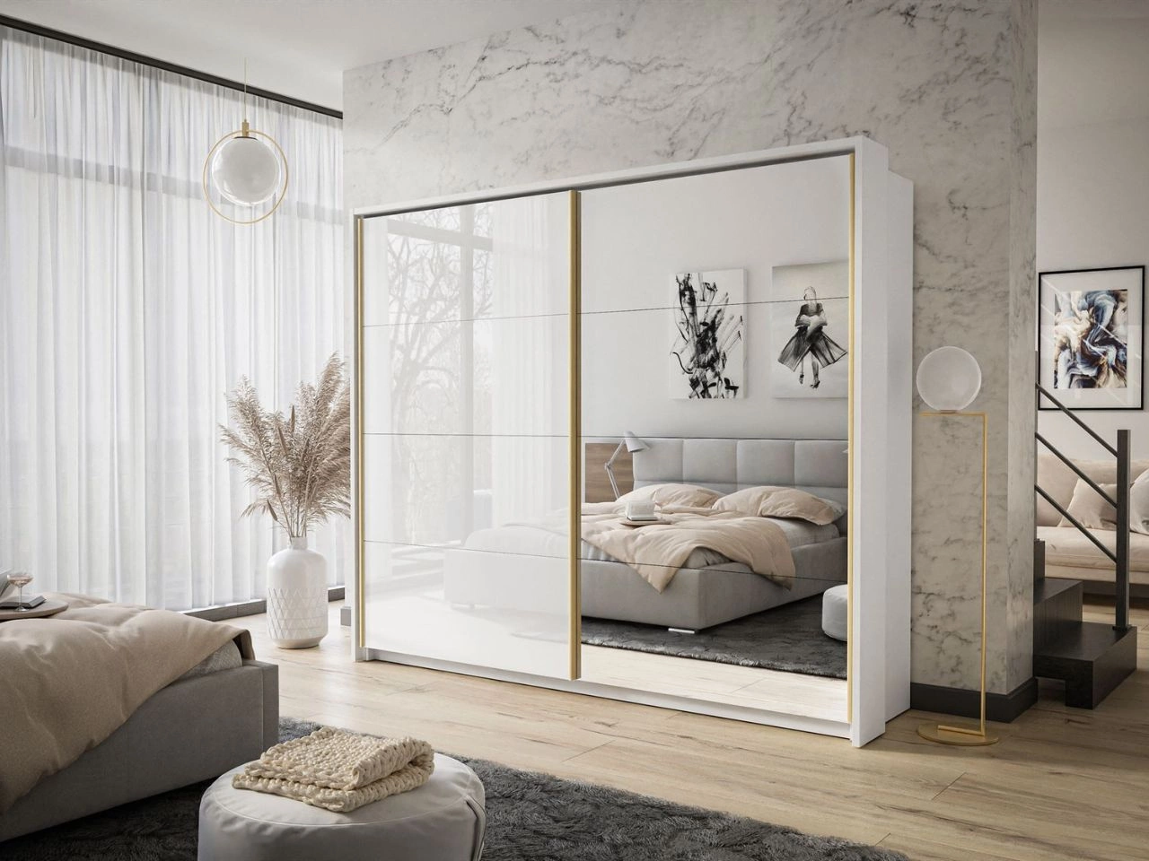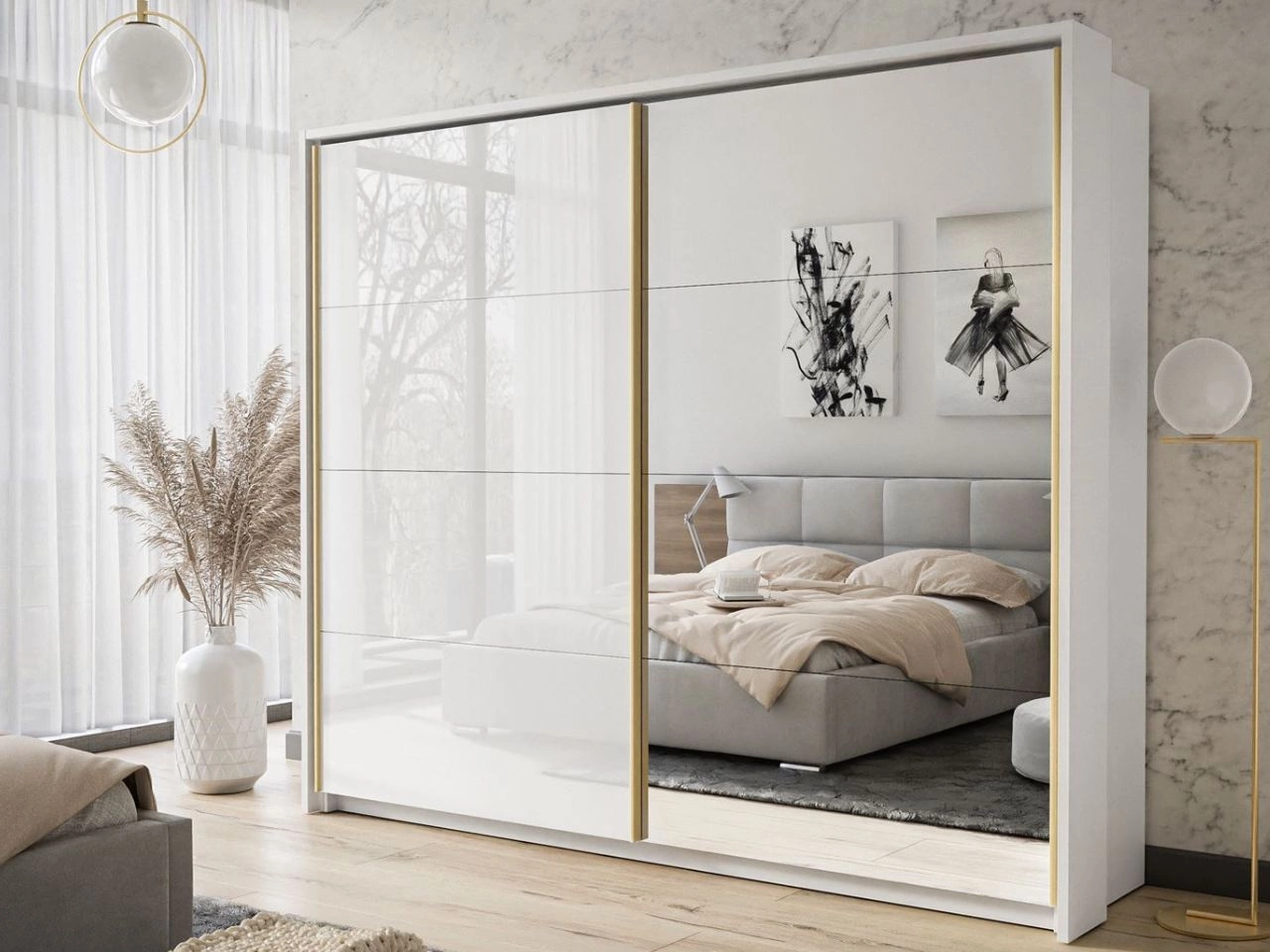 Jedno skrzydło szafy pokryto lustrem, co optycznie powiększa przestrzeń i nadaje wnętrzu głębi, a drugie wykończono w białym wysokim połysku, tworząc efektowny kontrast i podkreślając nowoczesny charakter mebla. Złote akcenty wzdłuż krawędzi dodają elegancji, a stabilne prowadnice gwarantują płynne przesuwanie drzwi.