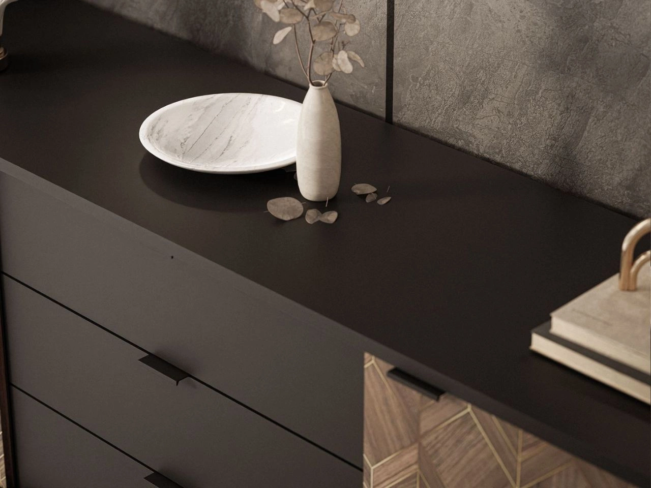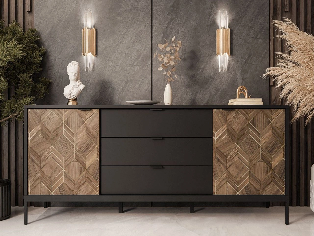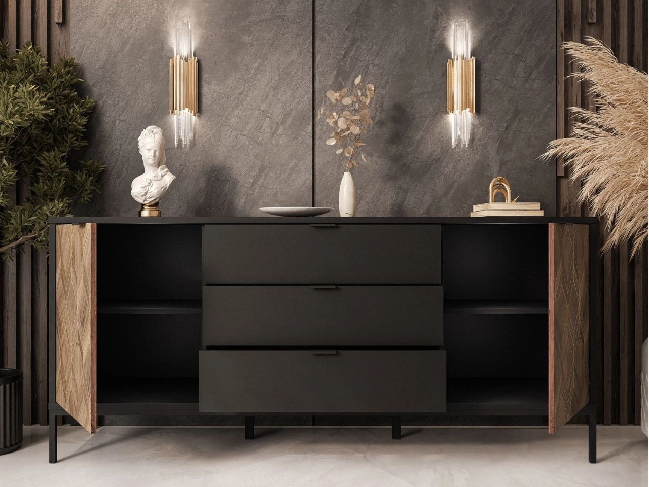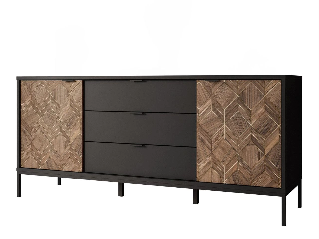 Komoda z drzwiami i szufladami Tavio oferuje dwie pojemne szafki skrywające cztery półki oraz trzy duże szuflady. Mebel jest osadzony na smukłych, czarnych nogach, co nadaje mu lekkości wizualnej i subtelnie unosi bryłę nad podłogą. Korpus w matowej czerni kontrastuje z dekoracyjnymi frontami szafek po bokach, które wykonano z płyty laminowanej w ciepłym odcieniu, ozdobionego geometrycznym wzorem ze złotymi akcentami.