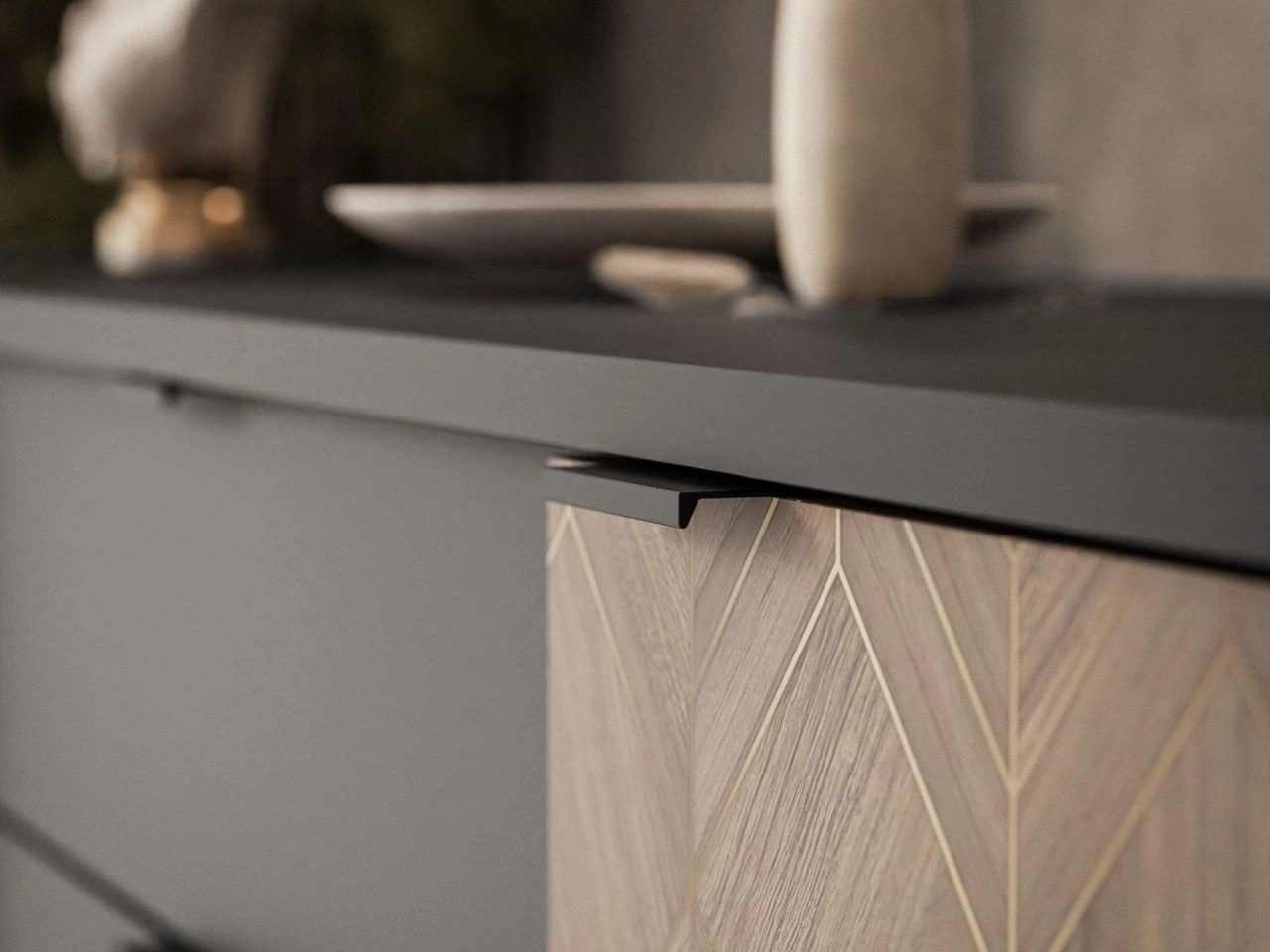 Front mebla zdobi dekor Tavio Gold, wyróżniający się subtelnym, złotym frezowaniem, które nadaje powierzchni trójwymiarowej głębi. Delikatny, ciepły odcień złota przełamuje prostotę formy, wnosząc do projektu nutę wysublimowanej elegancji i oryginalności. Zastosowany mechanizm cichego domyku sprawia, że zamykanie drzwi i szuflad odbywa się płynnie i bezgłośnie, co nie tylko podnosi komfort codziennego użytkowania, ale również sprzyja tworzeniu harmonijnej atmosfery we wnętrzu.